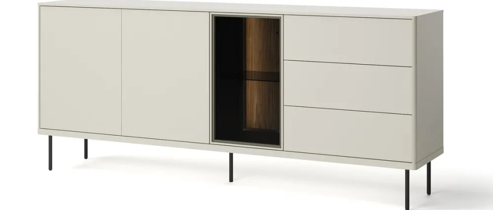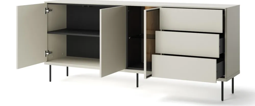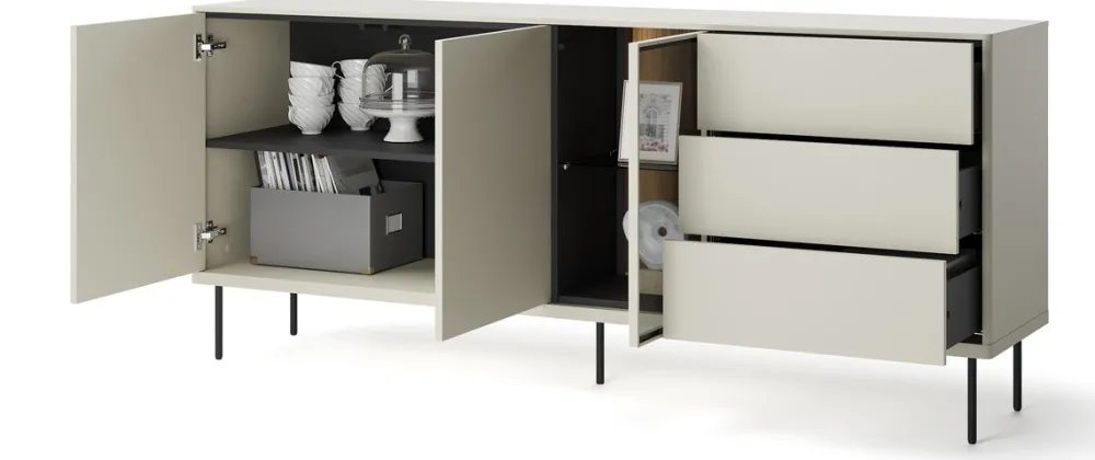 Komoda EPIRO to harmonia nowoczesnego stylu i praktycznych rozwiązań. Wykonana w ponadczasowym kolorze kaszmir, wprowadza do wnętrza ciepło i elegancję, a jej wysokie metalowe nogi dodają wizualnej lekkości. Fronty otwierane w systemie push to open to nie tylko wygoda, ale także minimalistyczny wygląd, który sprawia, że komoda doskonale wpasowuje się w nowoczesne aranżacje.