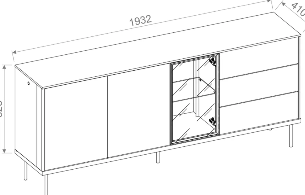 Dzięki trzem pojemnym szufladom z lewej strony wszystkie Twoje drobiazgi znajdą swoje miejsce, pomagając utrzymać porządek. Przeszklone drzwi w centralnej części z podświetlaną szklaną półką to idealna przestrzeń na wyeksponowanie dekoracji, książek czy pamiątek – dodatkowe oświetlenie dodaje im wyjątkowego uroku. Z kolei drzwi po prawej stronie kryją przestronną półkę, idealną do przechowywania większych przedmiotów, takich jak tekstylia czy dokumenty.