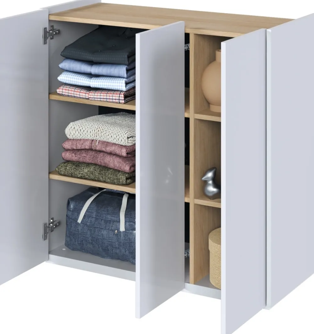 - Komoda posiada troje drzwi wyposażonych w zawiasy puszkowe z cichym domykiem. Zapewni to ciche zamykanie i pozwoli zapomnieć o trzaskach i hałasach.