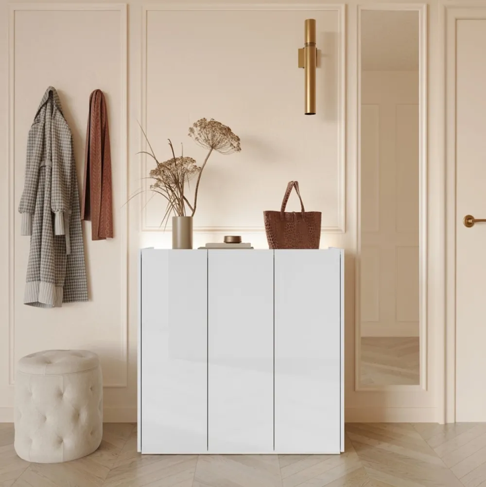 - Nowoczesna komoda o szerokości 95 cm EASY posiada troje drzwi, za którymi kryje się sześć półek gotowych na przechowywanie różnych przedmiotów i akcesoriów. Fronty komody wykończone zostały w białym połysku i posiadają cichy domyk.