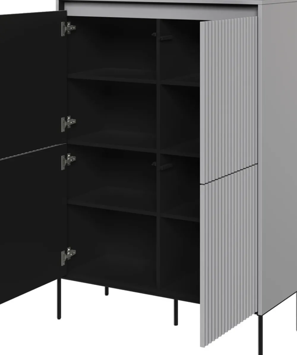 Podkreśl minimalizm i elegancję swojego wnętrza, dzięki naszej czterodrzwiowej komodzie TREND w subtelnym, szarym odcieniu. Precyzyjnie frezowane fronty, ze wzorem półkola, dodają komodzie unikalnej głębi i charakteru, wprowadzając do Twojego domu, współczesny i nowoczesny akcent.
