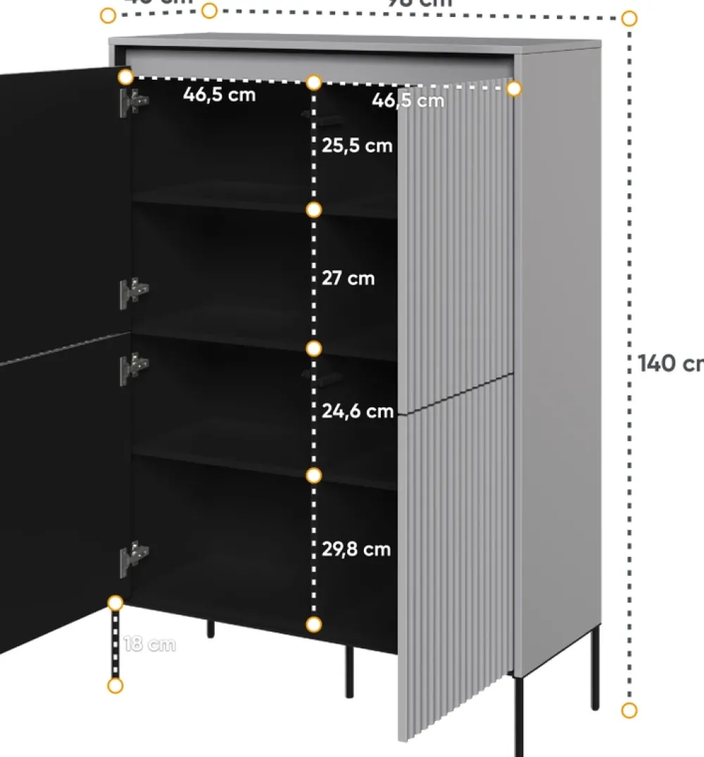Nowoczesna komoda o szerokości 98 cm jest doskonałym wyborem zarówno do przestronnych salonów, jak i do mniejszych pomieszczeń, gdzie optymalne wykorzystanie przestrzeni ma kluczowe znaczenie. Wysokie, metalowe nóżki nie tylko zapewniają stabilność konstrukcji, ale również dodają meblowi lekkości i nowoczesnego charakteru.