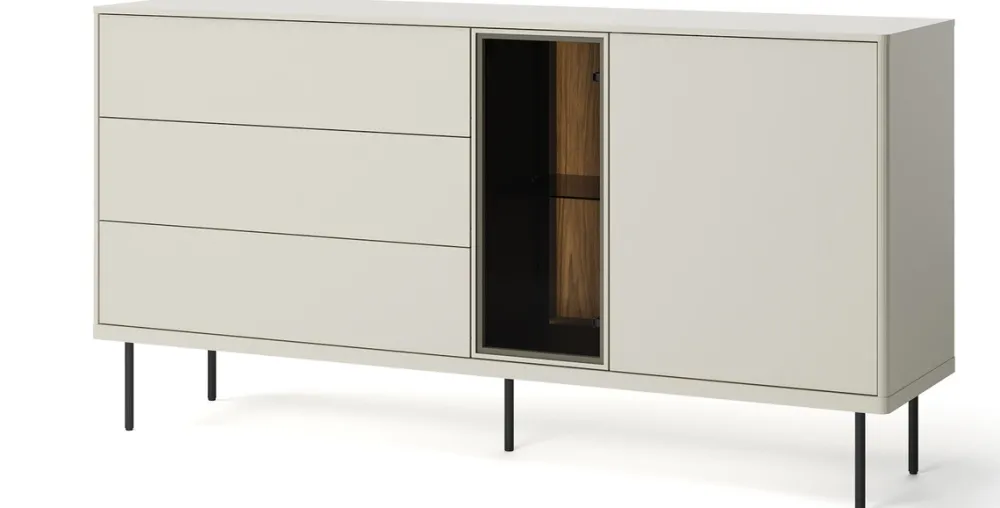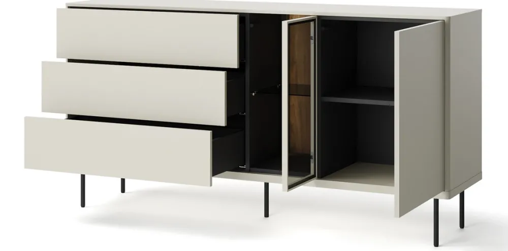 Komoda EPIRO to harmonia nowoczesnego stylu i praktycznych rozwiązań. Wykonana w ponadczasowym kolorze kaszmir, wprowadza do wnętrza ciepło i elegancję, a jej wysokie metalowe nogi dodają wizualnej lekkości. Fronty otwierane w systemie push to open to nie tylko wygoda, ale także minimalistyczny wygląd, który sprawia, że komoda doskonale wpasowuje się w nowoczesne aranżacje.