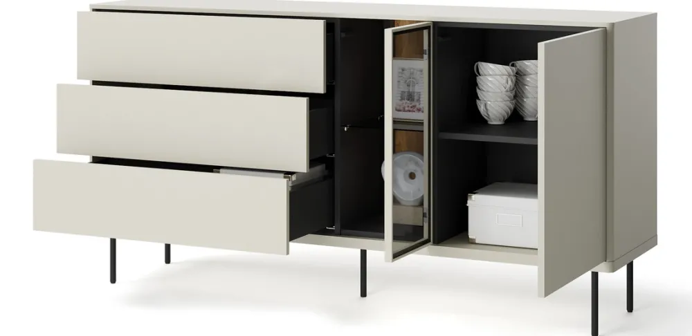 Każdy szczegół komody został zaprojektowany z myślą o komforcie i stylu. Solidna konstrukcja zapewnia trwałość na lata, a nowoczesne rozwiązania, takie jak system push to open, sprawiają, że korzystanie z mebla to czysta przyjemność.