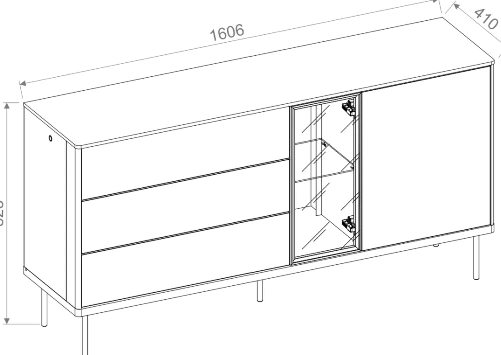 Dzięki trzem pojemnym szufladom z lewej strony wszystkie Twoje drobiazgi znajdą swoje miejsce, pomagając utrzymać porządek. Przeszklone drzwi w centralnej części z podświetlaną szklaną półką to idealna przestrzeń na wyeksponowanie dekoracji, książek czy pamiątek – dodatkowe oświetlenie dodaje im wyjątkowego uroku. Z kolei drzwi po prawej stronie kryją przestronną półkę, idealną do przechowywania większych przedmiotów, takich jak tekstylia czy dokumenty.