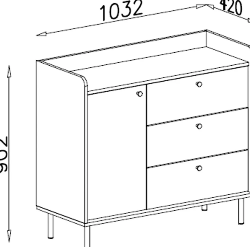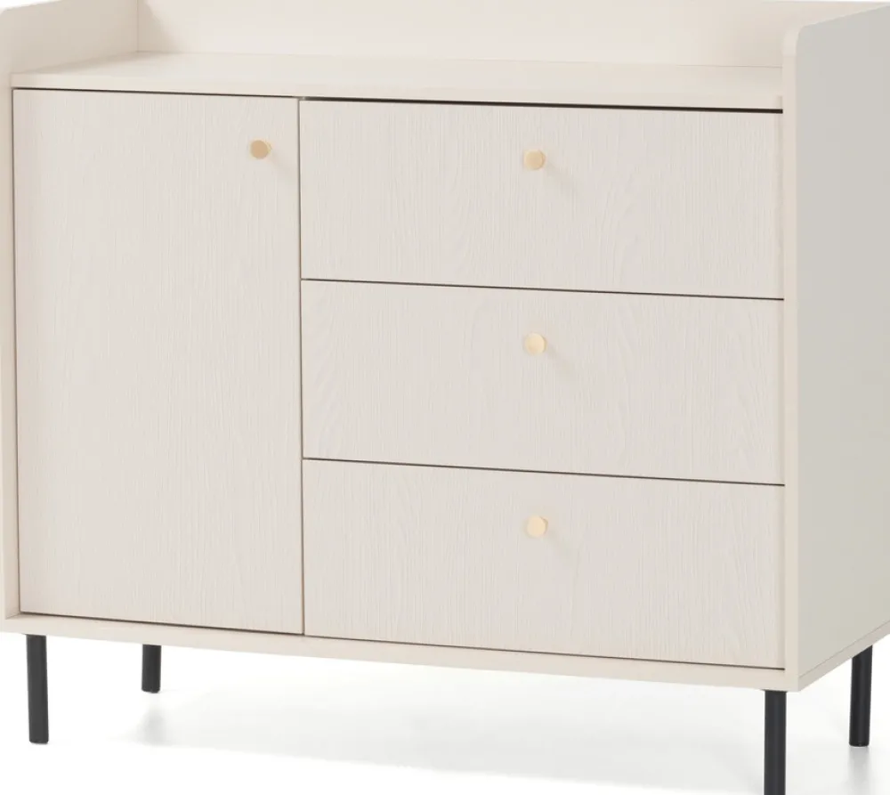 - Nowoczesna komoda GAVIA z trzema szufladami i jednymi drzwiami, idealna do przechowywania. Wykonana z laminowanej płyty 16 mm z obrzeżami ABS. Fronty z efektem drewna, złote uchwyty i czarne metalowe nóżki tworzą elegancką, a zarazem praktyczną całość.