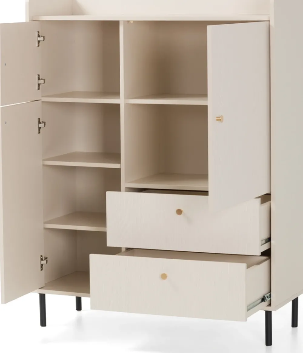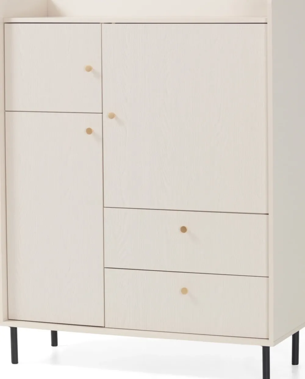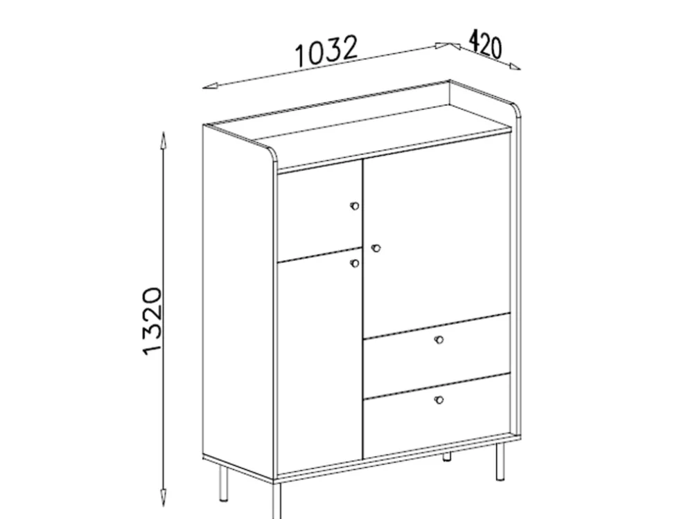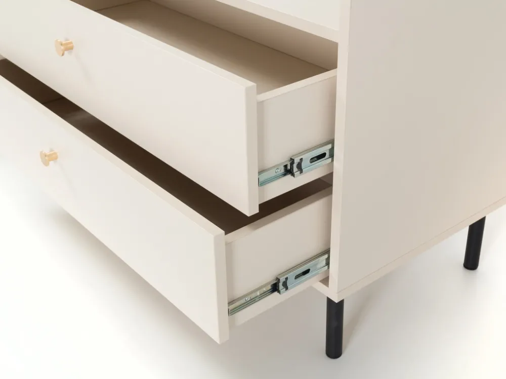 Komoda GAVIA to przemyślane połączenie przestronnych wnętrz z dopracowanymi detalami. Dzięki pojemnym szafkom i szufladom z łatwością uporządkujesz dokumenty, ubrania czy akcesoria, a podwyższona krawędź blatu zapobiega spadaniu dekoracji czy drobiazgów.