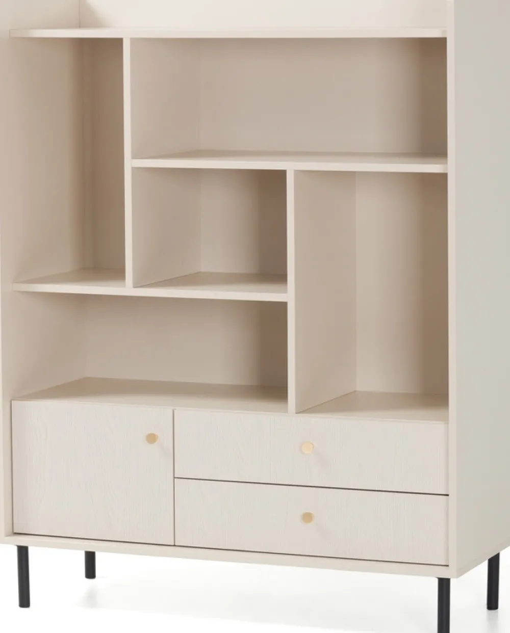 - Regał GAVIA z pięcioma wnękami, dwiema szufladami i zamykaną szafką to połączenie stylu i funkcjonalności. Wykonany z laminowanej płyty 16 mm, z obrzeżami ABS. Złote uchwyty, metalowe nóżki i drewniana struktura frontów dopełniają nowoczesny wygląd.
