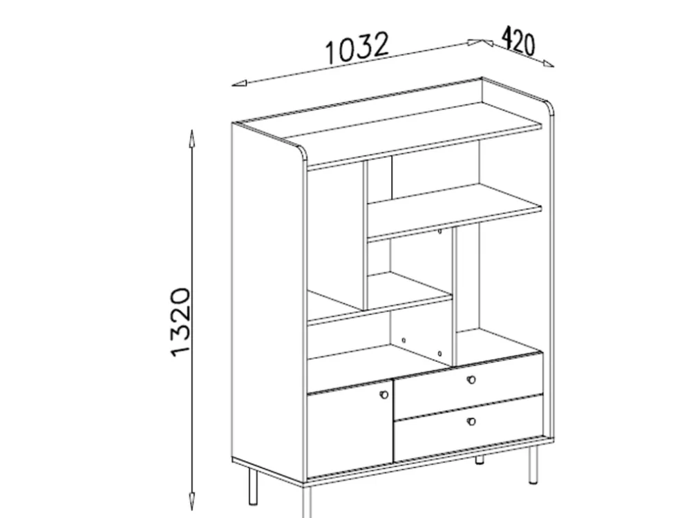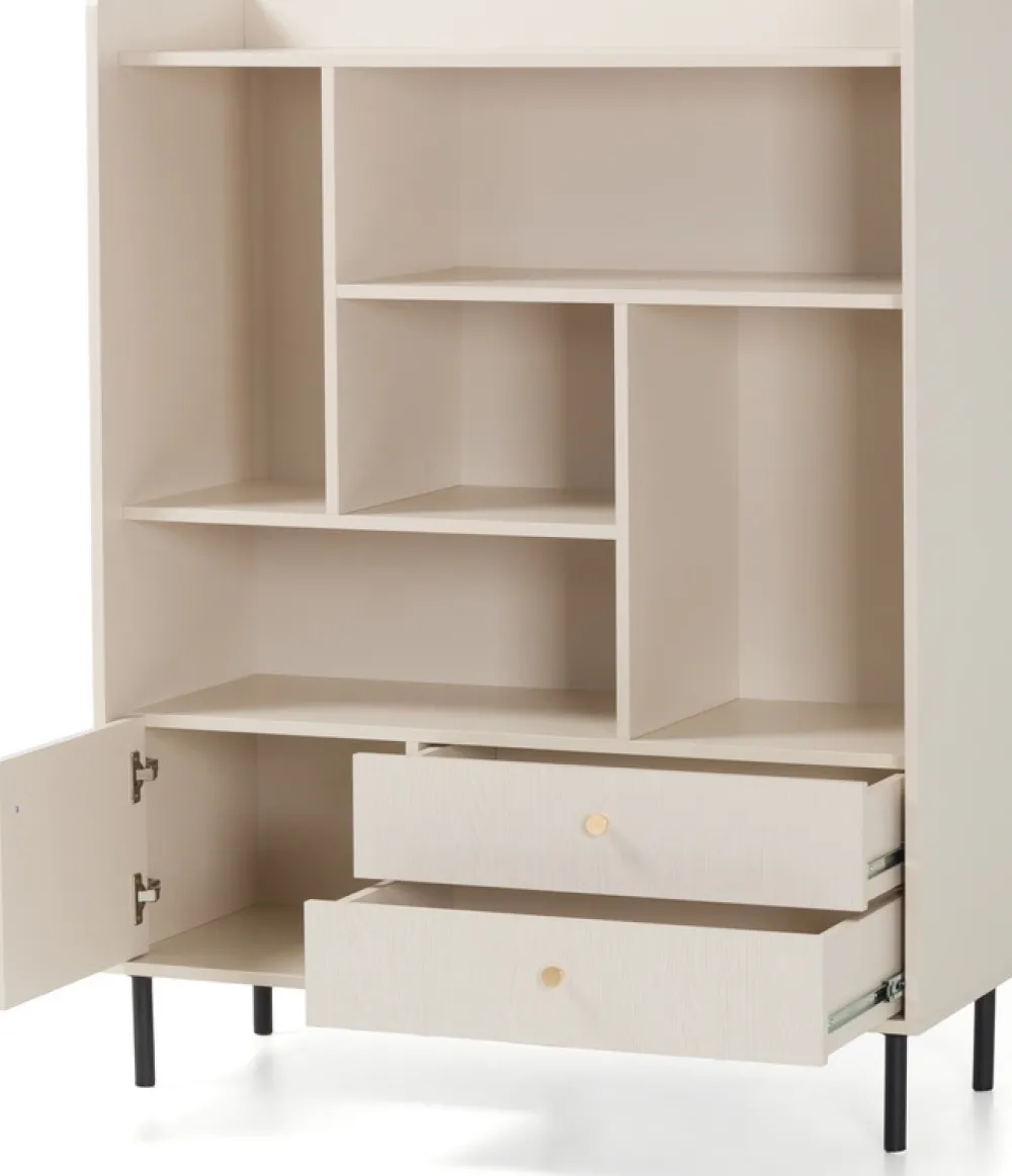 Regał GAVIA to idealne połączenie otwartej ekspozycji z funkcjonalnym przechowywaniem. Dzięki pięciu wnękom, pojemnym szufladom i zamykanej szafce z łatwością uporządkujesz książki, dekoracje czy dokumenty, zachowując jednocześnie spójną i stylową estetykę wnętrza.