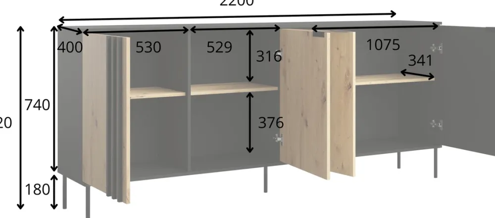 - Komoda RUSTICA 220 cm to czarny korpus z dębem artisan i frontami z lamelami. Wyposażona w 4 drzwi, 6 półek i metalowe nóżki 18 cm, łączy nowoczesny styl z funkcjonalnością. Idealna do salonu, jadalni czy gabinetu.