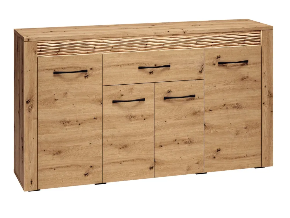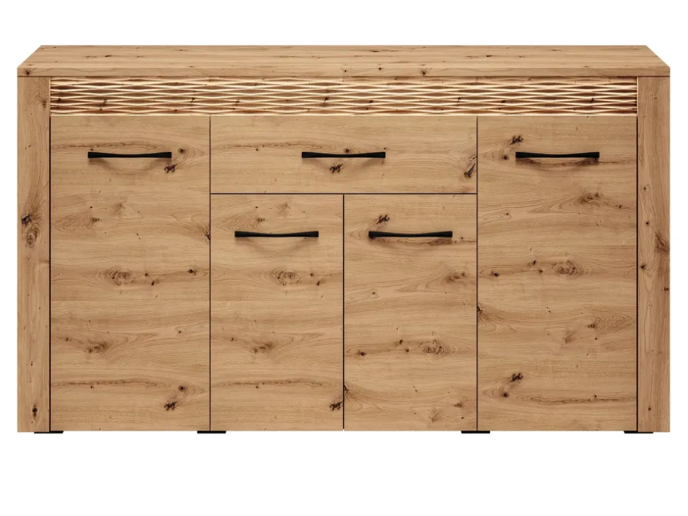 - Komoda do salonu 165 cm ARTIS posiada cztery drzwi, za lewymi oraz prawymi znajduje się półka, w centralnej części znajduje się szuflada a pod nią drzwi a za nimi półka. Komoda posiada czarne metalowe uchwyty oraz obrzeża wykończone okleiną ABS.