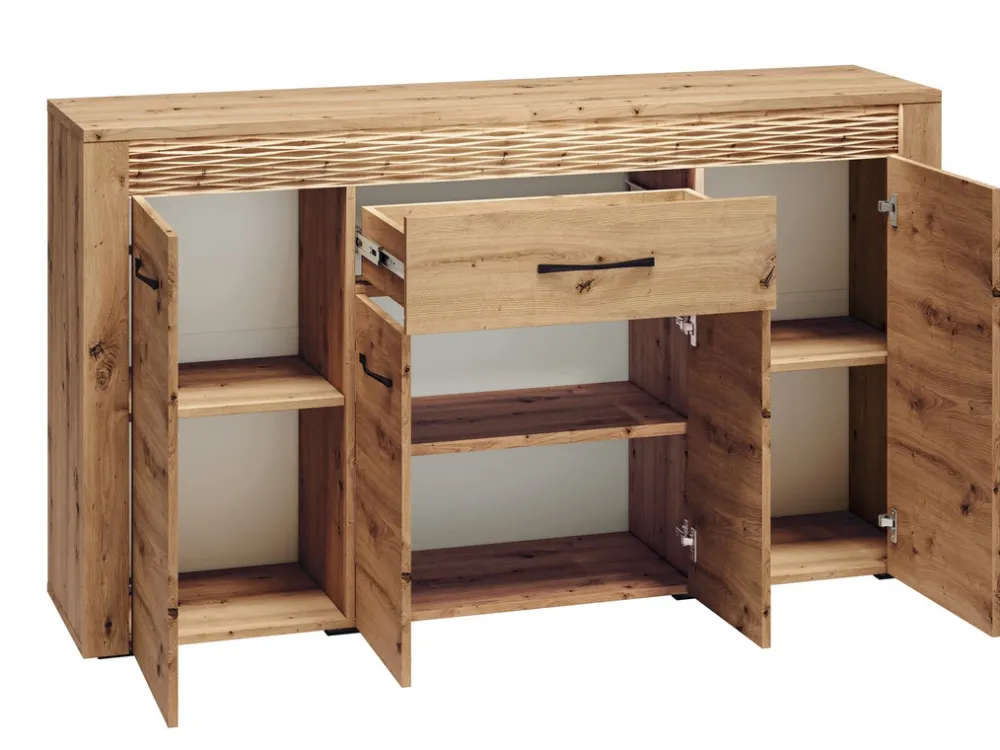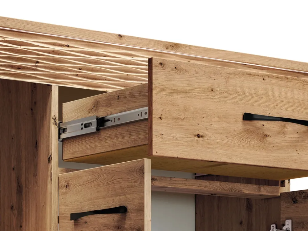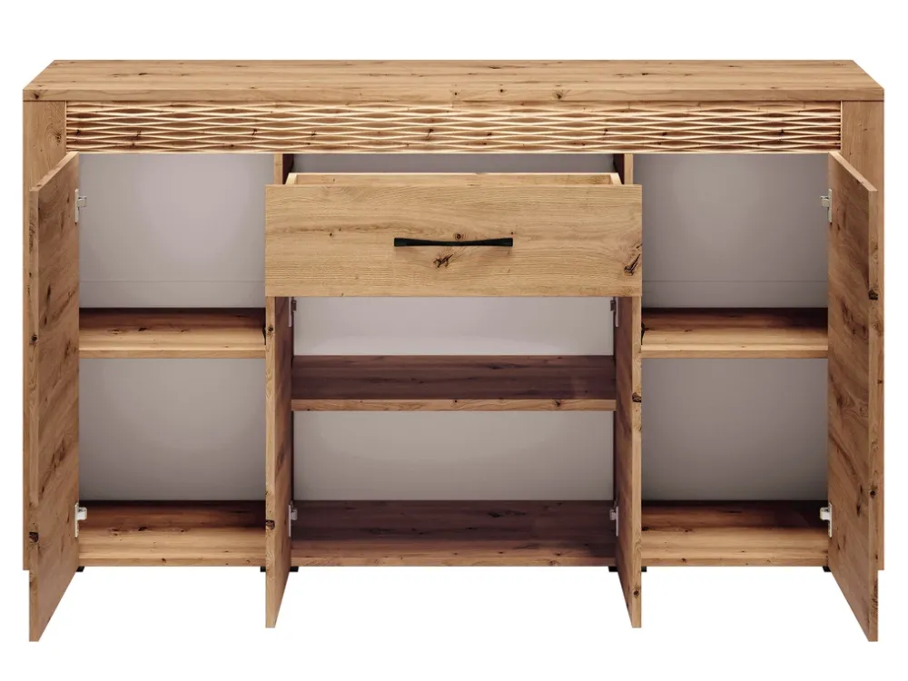 Komoda została zaprojektowana z myślą o maksymalnym wykorzystaniu przestrzeni. Po lewej i prawej stronie znajdują się drzwi, za którymi ukryto pojemne półki, idealne na przechowywanie różnorodnych przedmiotów. W centralnej części komody umieszczono wygodną szufladę, która doskonale nadaje się na drobiazgi, które warto mieć zawsze pod ręką. Pod nią znajdują się kolejne drzwi, za którymi ukryta jest dodatkowa półka, oferująca jeszcze więcej miejsca na Twoje rzeczy.