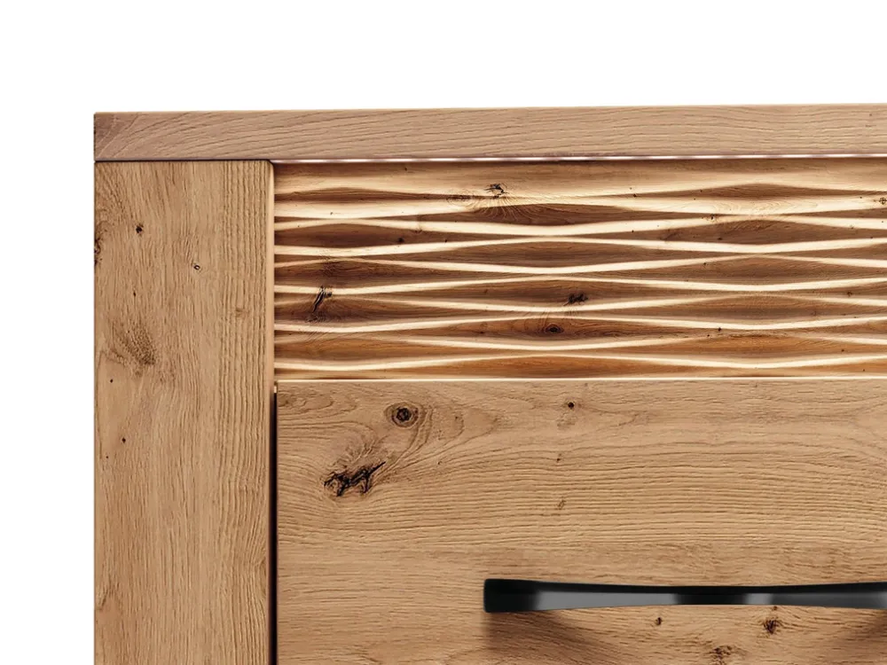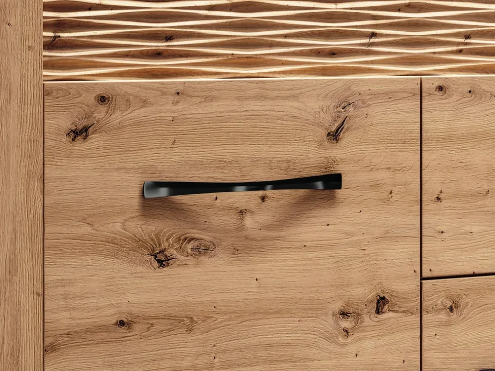 Czarne metalowe uchwyty to element, który nadaje komodzie wyjątkowego charakteru. Eleganckie i minimalistyczne, doskonale komponują się z całością, podkreślając nowoczesny styl mebla. Obrzeża wykończone okleiną ABS nie tylko dodają komodzie trwałości, ale także sprawiają, że jest odporna na uszkodzenia i zarysowania.