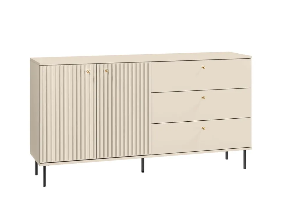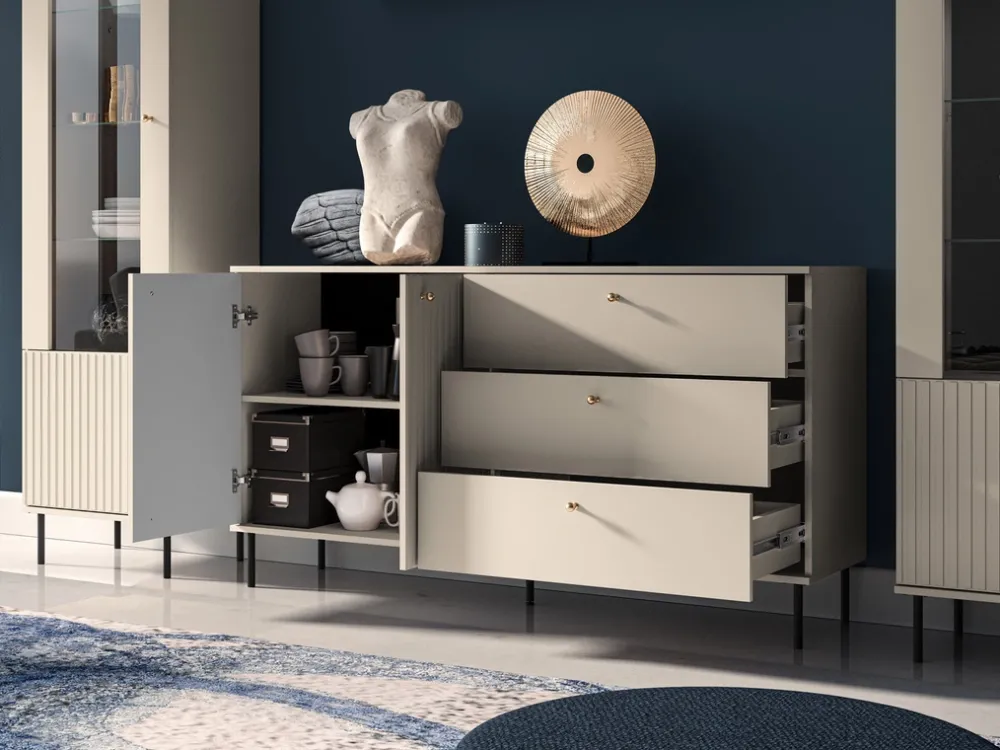 Wprowadź do swojego salonu powiew nowoczesnej elegancji z naszą wyjątkową komodą SOPHIE. Korpus oraz fronty szuflad wykonane są z wytrzymałej płyty laminowanej, gwarantując trwałość i odporność na codzienne użytkowanie. Fronty drzwi, zrobione z płyty MDF, dodają komodzie dodatkowego szyku i subtelnego wyrafinowania.