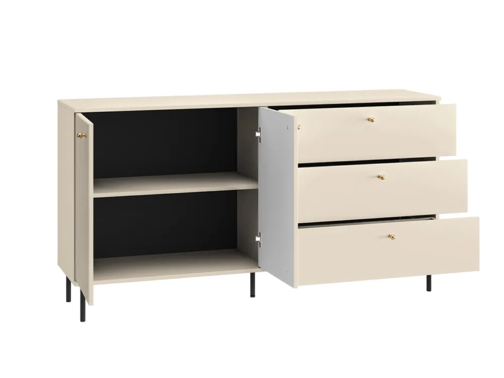 Komoda posiada dwoje drzwi oraz trzy przestronne szuflady, co czyni ją niezwykle funkcjonalnym meblem, idealnym do przechowywania zarówno odzieży, jak i innych przedmiotów codziennego użytku. Dzięki przemyślanemu układowi przestrzeni wszystko znajdzie swoje miejsce, a Twój salon zyska na porządku i harmonii. Wewnątrz komody znajduje się jedna półka, co pozwala na wygodne przechowywanie różnorodnych przedmiotów.