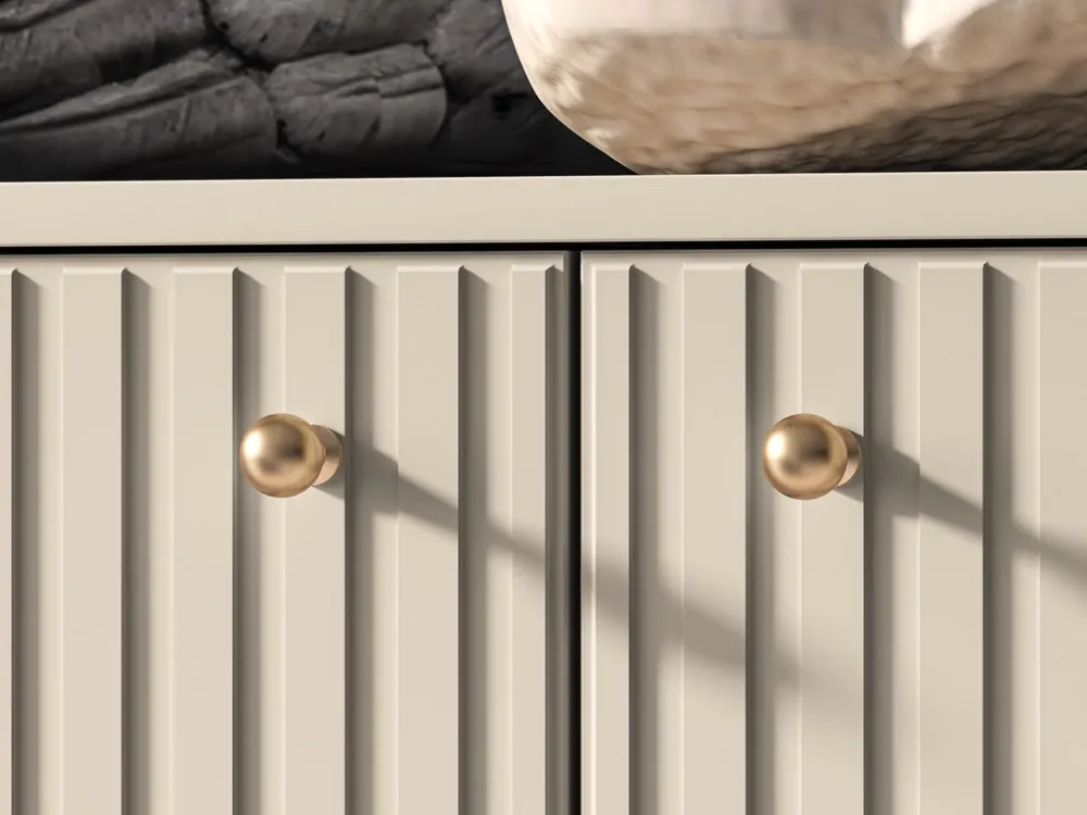 Drzwi komody zamontowane są na zawiasach puszkowych wyposażonych w system cichego domyku, co gwarantuje komfort użytkowania oraz ciszę w domowym zaciszu. Metalowe uchwyty w kolorze złotym dodają elegancji i stanowią wyrafinowany akcent, który przyciąga wzrok. charakter.
