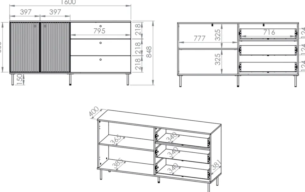 - Korpus oraz front komody wykonano z płyty laminowanej 16 mm, natomiast część frontu z lamelami wykonano z płyty MDF. Płyta laminowana charakteryzuje się odpornością na drobne zarysowania, a płyta MDF jest materiałem o wysokiej gęstości, co również przekłada się na jej wytrzymałość.