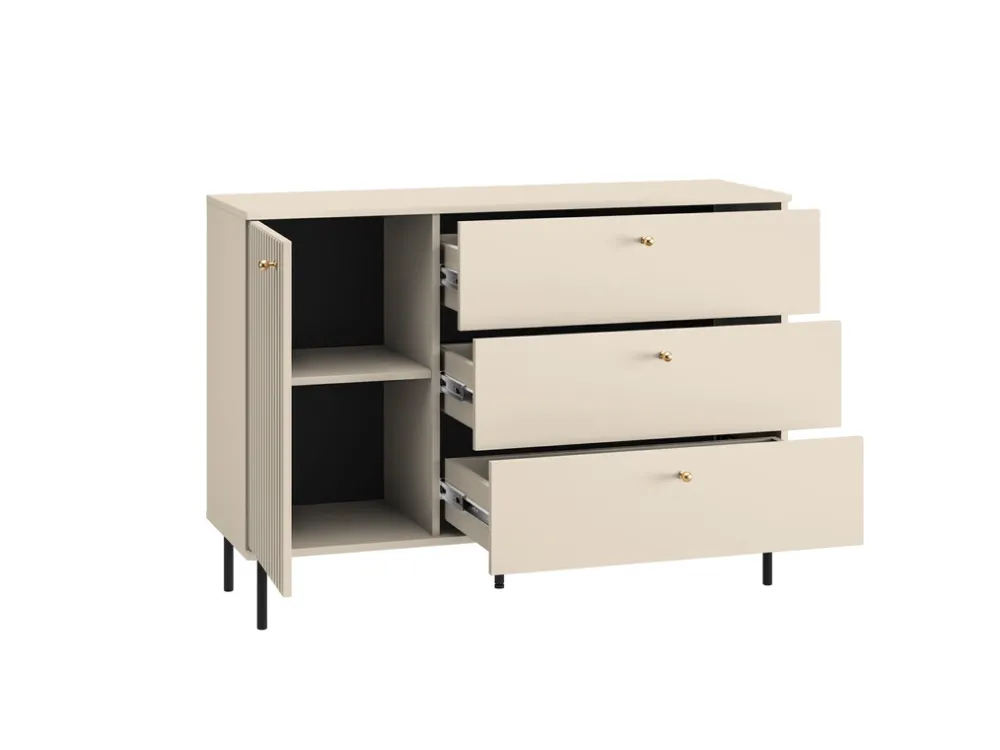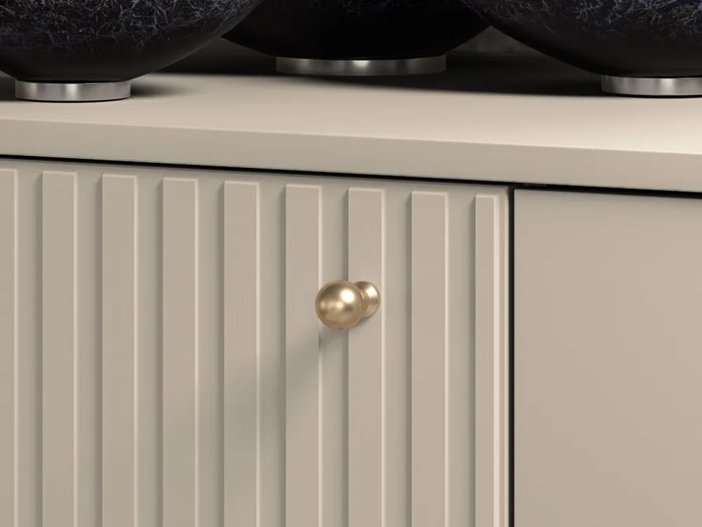 Drzwi komody osadzone są na zawiasach puszkowych z systemem cichego domyku, co gwarantuje komfort użytkowania i zapobiega trzaskaniu. Uchwyty wykonane z metalu w eleganckim, złotym kolorze dodają komodzie luksusowego charakteru, stanowiąc przy tym funkcjonalny element ułatwiający otwieranie. Nóżki z metalu w kolorze czarnym podkreślają nowoczesny design komody, jednocześnie zapewniając jej stabilność.