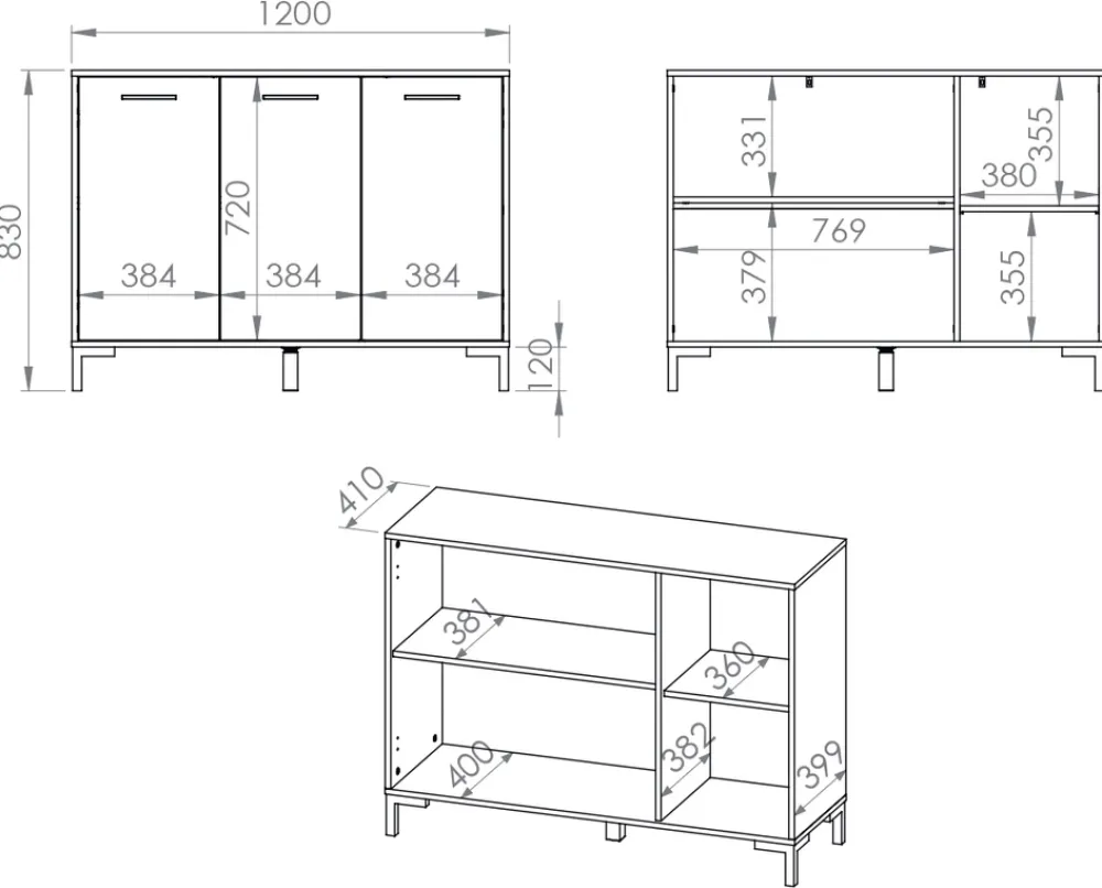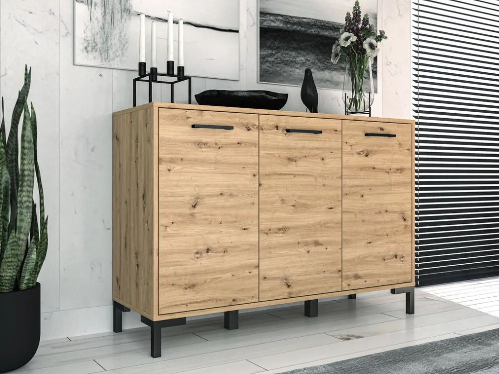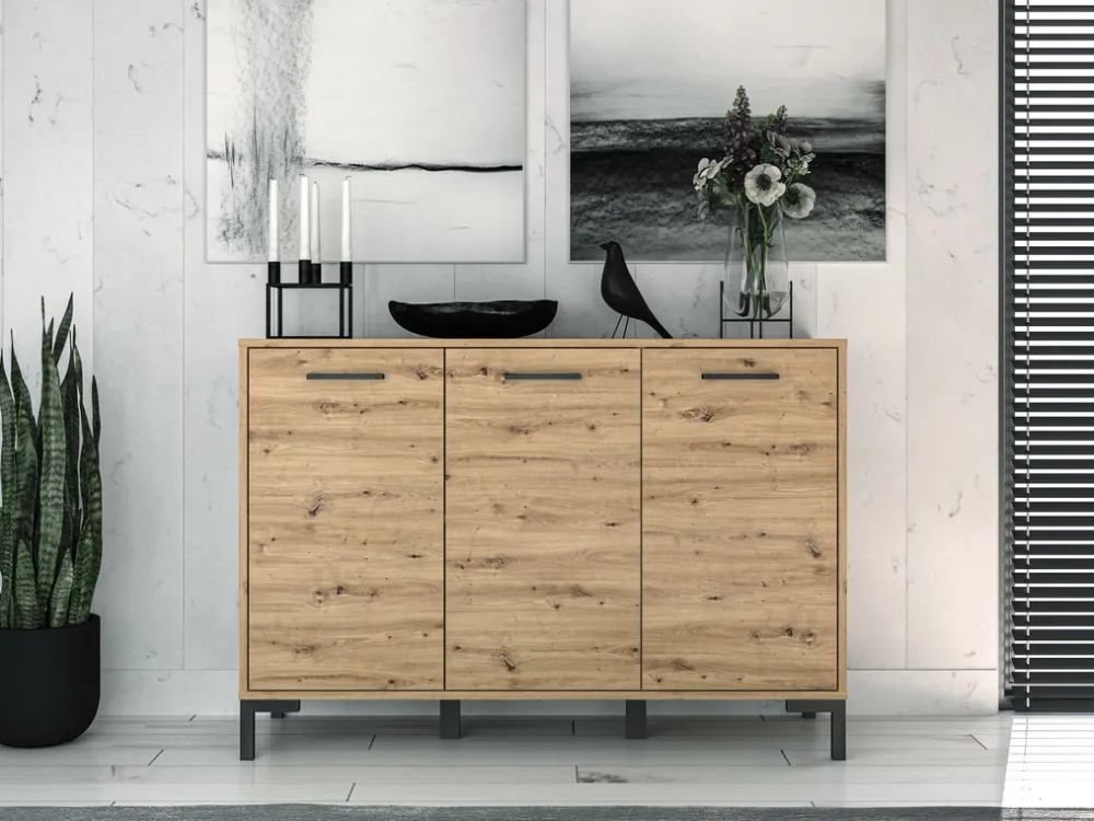 - Trzydrzwiowa komoda NEVIO do salonu o szerokości 120 cm. Została wykonana z płyty laminowanej, dodatkowo krawędzie zabezpieczono okleiną ABS. Komoda posiada drzwi na zawiasach puszkowych. Nogi i uchwyty z tworzywa sztucznego w kolorze czarnym.