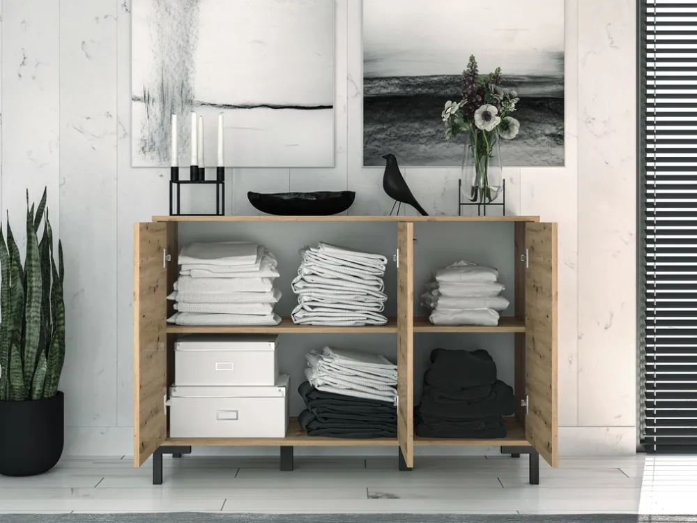 Komoda wyposażona jest w trzy drzwi, osadzone na solidnych zawiasach puszkowych. Dzięki temu mechanizmowi drzwi otwierają się płynnie i bezszelestnie, co znacząco podnosi komfort użytkowania. Wnętrze komody kryje dodatkowe dwie przestronne półki, które pomogą w uporządkowaniu przestrzeni i przechowywaniu niezbędnych przedmiotów.