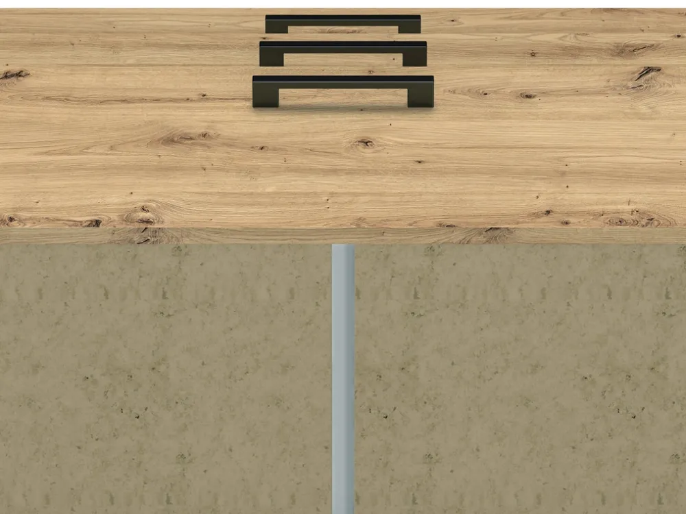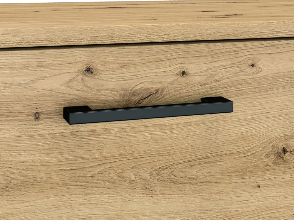 Dodatkowym atutem tego mebla są uchwyty i nóżki wykonane z tworzywa sztucznego w kolorze czarnym. Te subtelne detale nadają komodzie wyjątkowego charakteru, jednocześnie zapewniając jej stabilność i trwałość. Czarny kolor uchwytów i nóżek tworzy kontrast z laminowaną powierzchnią, podkreślając nowoczesny design komody.