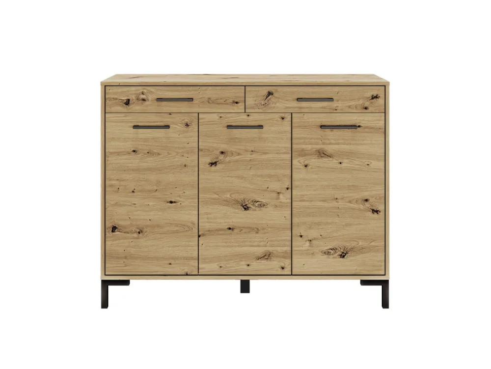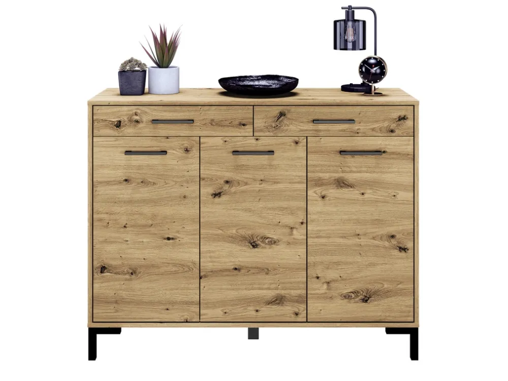 - Przedstawiamy trzydrzwiową komodę z szufladami NEVIO o szerokości 120 cm. Wykonana została z płyty laminowanej, krawędzie dodatkowo zabezpieczono okleiną ABS. Uchwyty i nóżki zostały wykonane z tworzywa sztucznego w kolorze czarnym.
