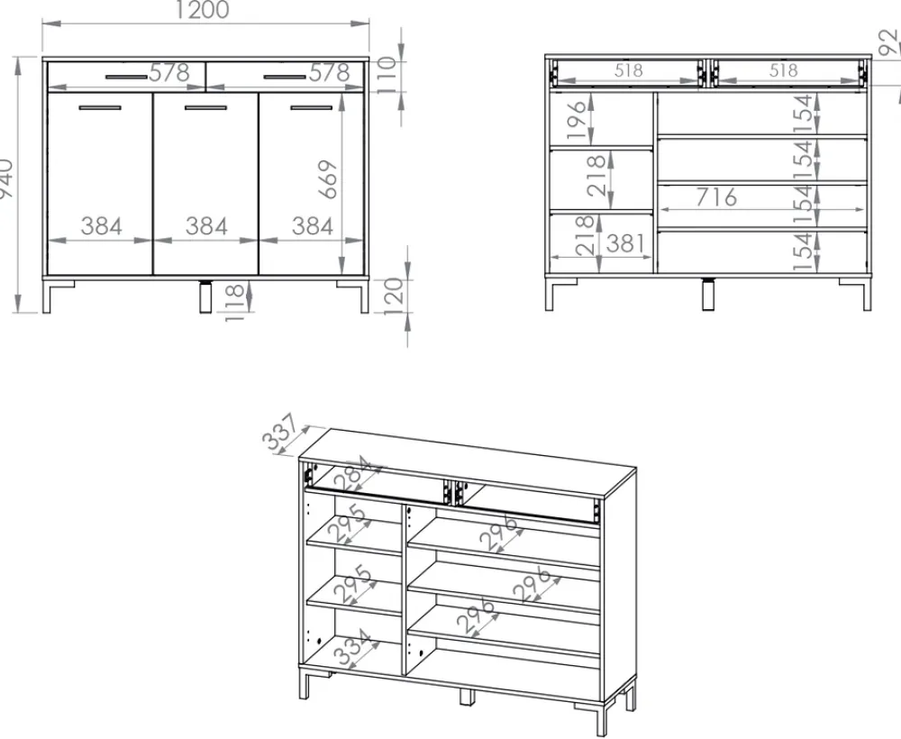 - Komoda posiada trzy szuflady poruszające się na prowadnicach kulkowych.