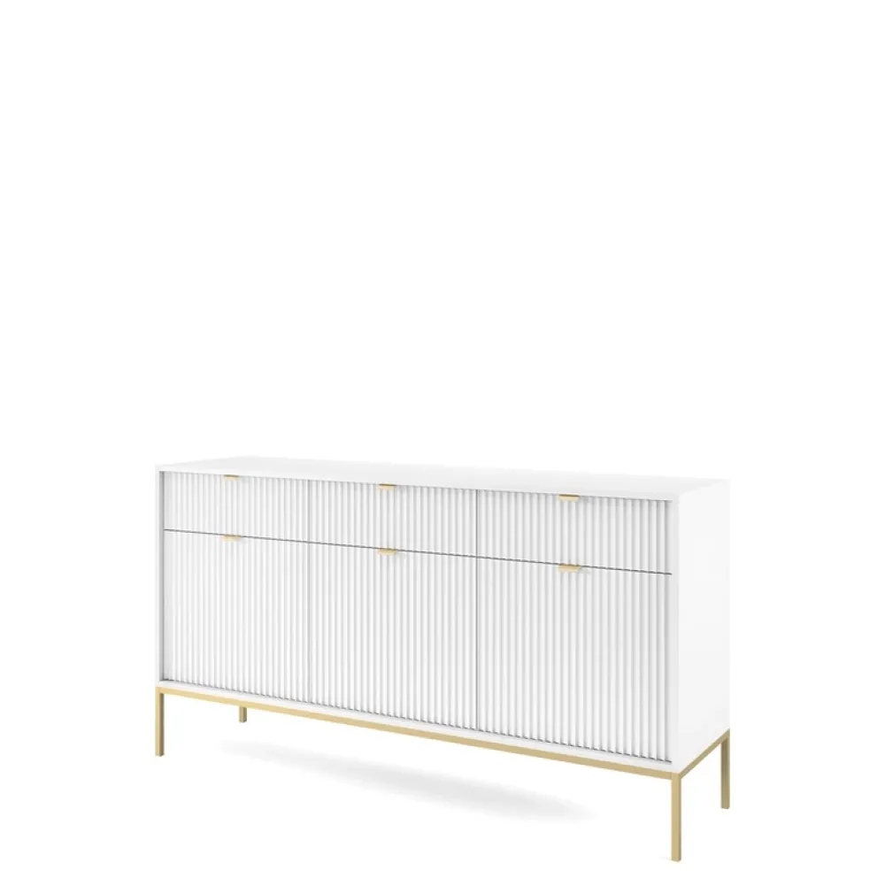 - Wykwintna komoda AVANTI w stylu glamour. Korpus w bieli kontrastuje z ryflowanymi frontami MDF, podkreślając ich wyrafinowany design. Złote, metalowe nogi dodają elegancji. Mieszanka funkcjonalności i luksusu!