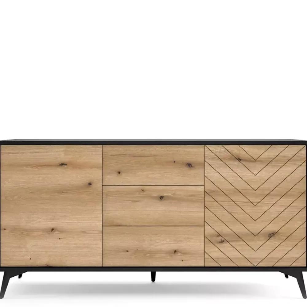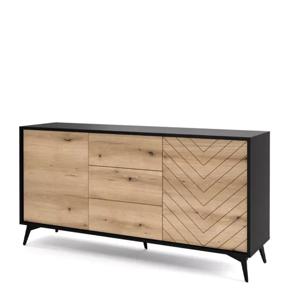 Duża komoda o szerokości 153,4 cm sprawdzi się w salonie, sypialni, ale także w biurze. Komoda została wyposażona w trzy pojemne szuflady w środkowej części oraz po jednej półce po zewnętrznych jej stronach. Na prawym froncie widnieje przepiękna jodełka. Komoda osadzona jest na czarnych, metalowych nóżkach o wysokości 14 cm. Komoda nie posiada uchwytów, ponieważ wyposażono ją w wygodny w użytkowaniu system push to open. Czarny korpus świetnie komponuje się z drewnopodobnym odcieniem dębu evoke.