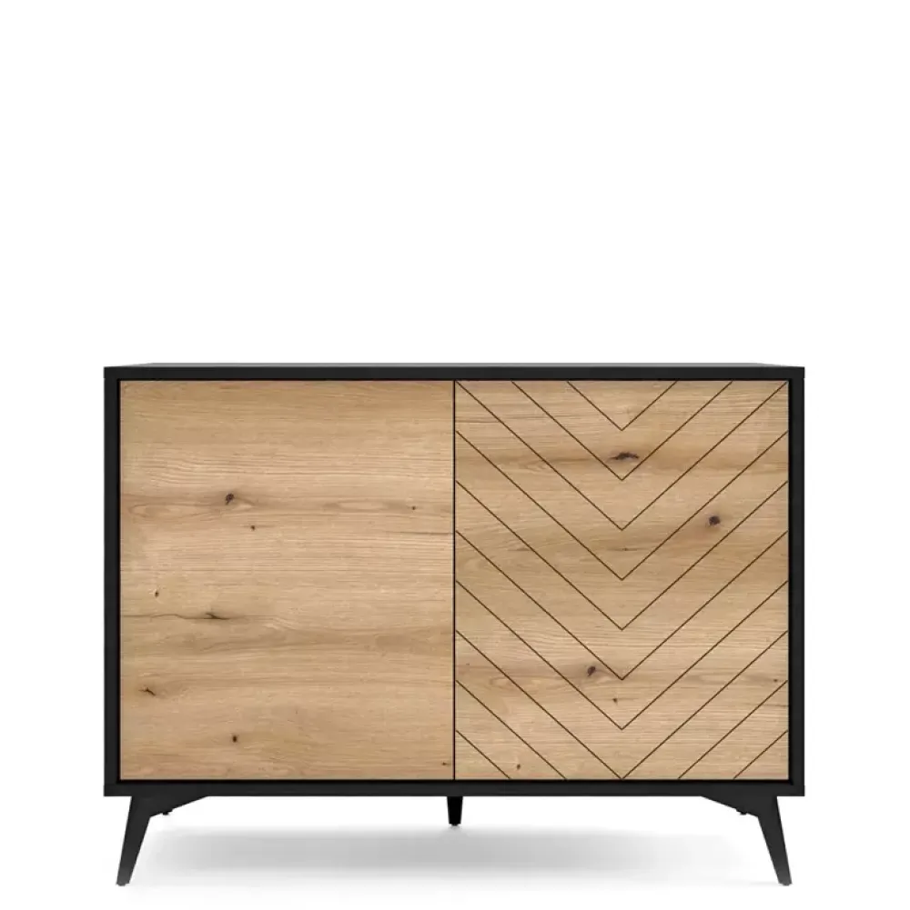 Pojemna i nowoczesna komoda o szerokości 103,5 cm została wyposażona w dwie półki przedzielone na pół w pionie, co daje Ci cztery wnęki do przechowywania. Komoda osadzona jest na czarnych, metalowych nóżkach o wysokości 14 cm. Komoda nie posiada uchwytów, ponieważ wyposażono ją w wygodny w użytkowaniu system push to open. Czarny korpus świetnie komponuje się z drewnopodobnym odcieniem dębu evoke, który wzbogacono frezami na kształt jodełki.
