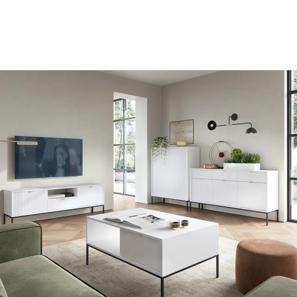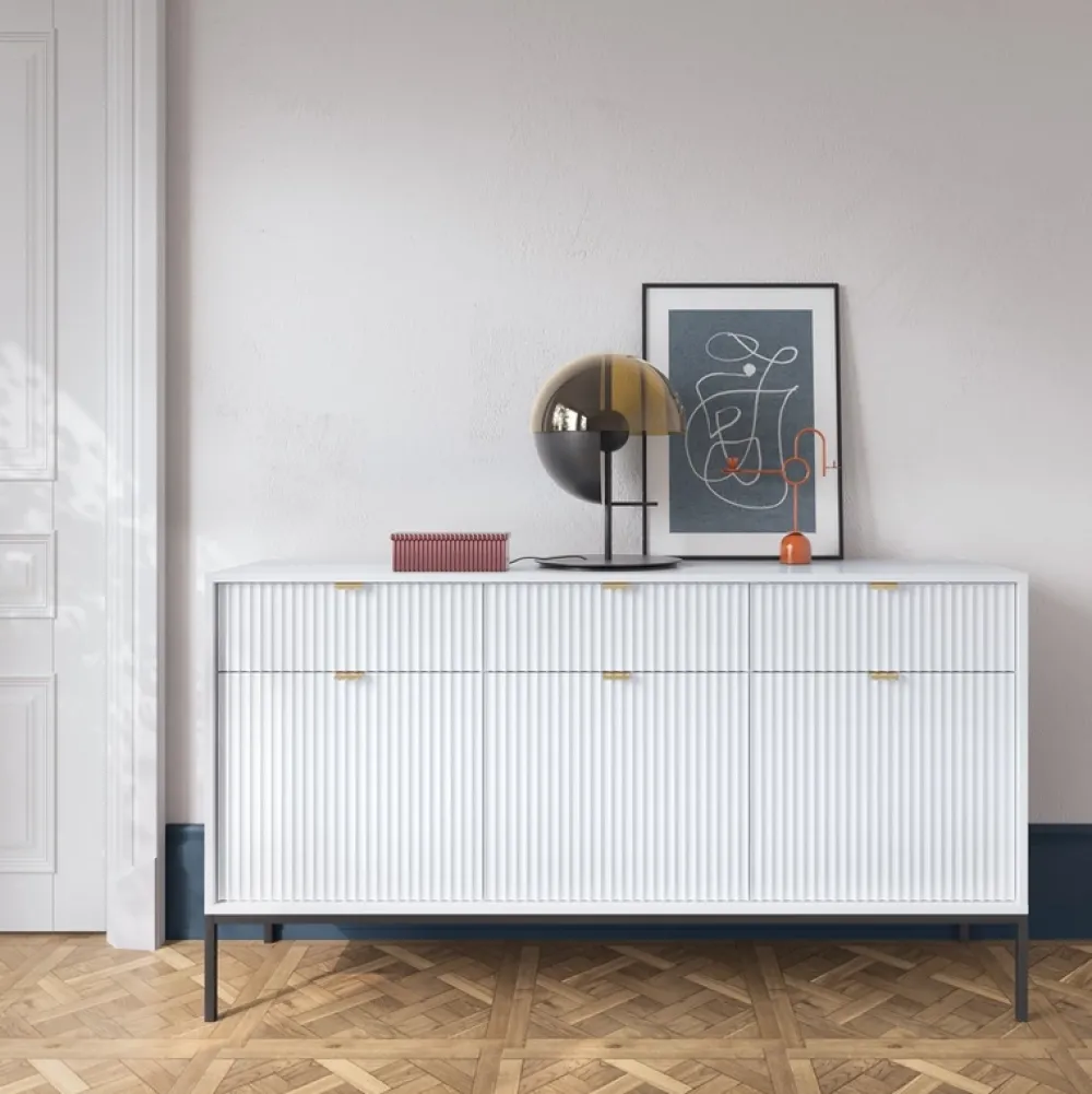 Biała komoda AVANTI o szerokości 154 cm posiada trzy szuflady i sześć niezależnych wnęk, w których znajdziesz dużo miejsca do przechowywania. Ryflowane fronty z pewnością przyciągną oko odwiedzających Twój dom gości, a złote uchwyty zapewnią Ci wygodny dostęp do wnętrza komody. Konstrukcję osadzono na metalowych nóżkach malowanych proszkowo na czarno. Taka podpora zapewni stabilność mebla.