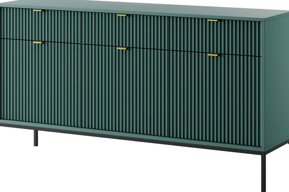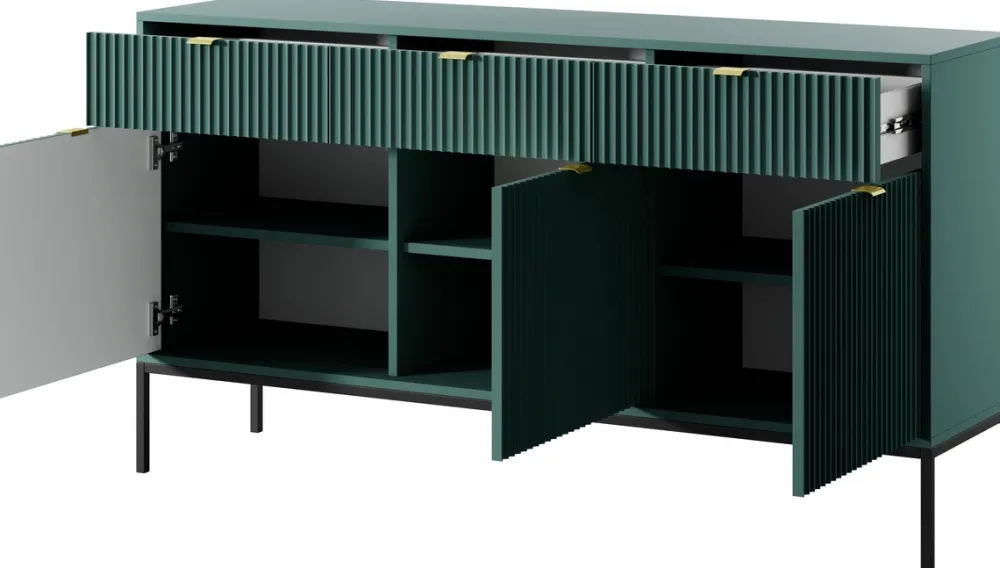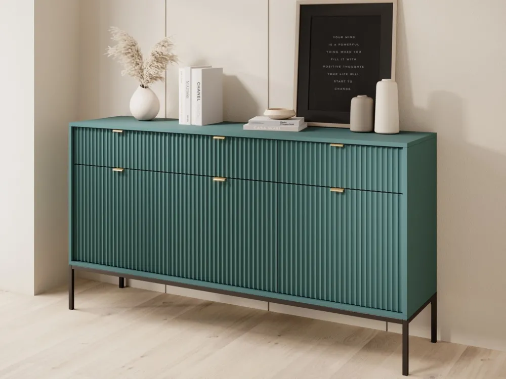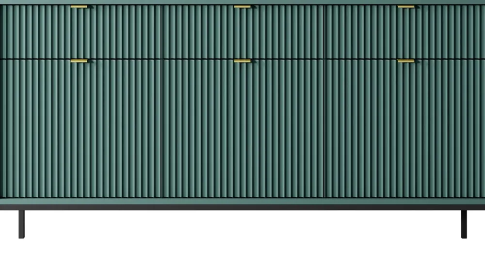 - Komoda z szufladami AVANTI posiada ryflowane fronty, które doskonale wpisują się we współczesne aranżacje pomieszczeń. Komoda posiada trzy szuflady u góry, oraz troje drzwi z półkami u dołu. Uchwyty wykonano z aluminium, natomiast nogi z metalu.
