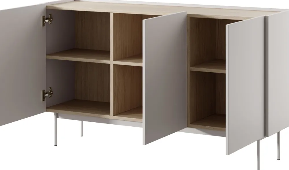 Komoda CRYSTAL została wyposażona w trzy pojemne szafki, a za każdymi drzwiami kryją się dwie przestronne półki. To idealne miejsce na uporządkowanie książek, dokumentów, dekoracji czy zastawy stołowej. Dzięki przemyślanemu układowi z łatwością utrzymasz porządek w swoim wnętrzu.