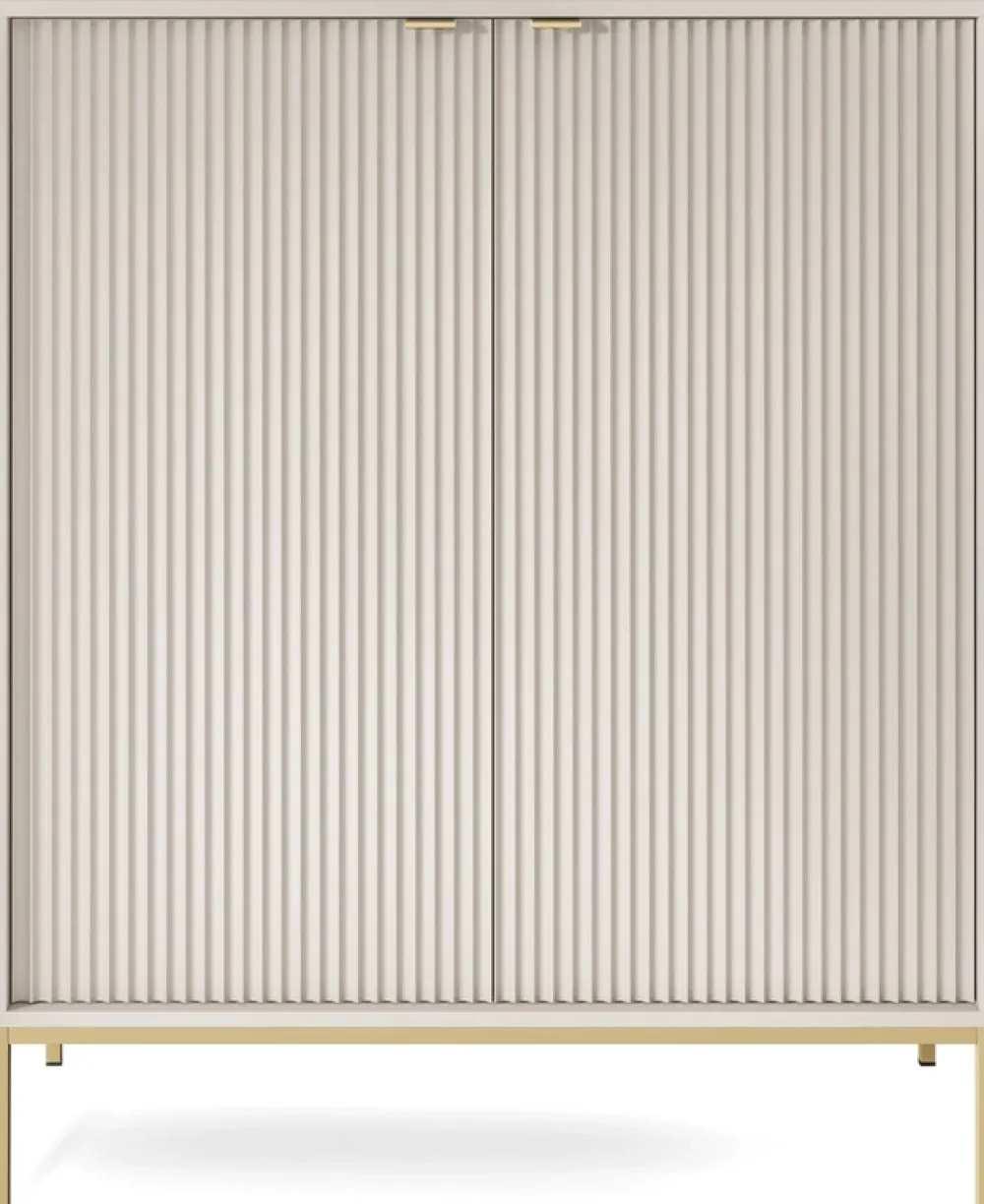 - Komoda do salonu AVANTI została wyposażona w drzwi z ryflowanymi frontami, za którymi znajdują się cztery półki. Uchwyty komody wykonano z aluminium w złotym kolorze. Dodatkowo wysokie metalowe nóżki pozwalają na swobodne odkurzanie.