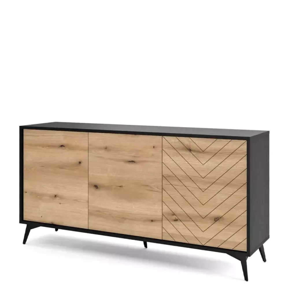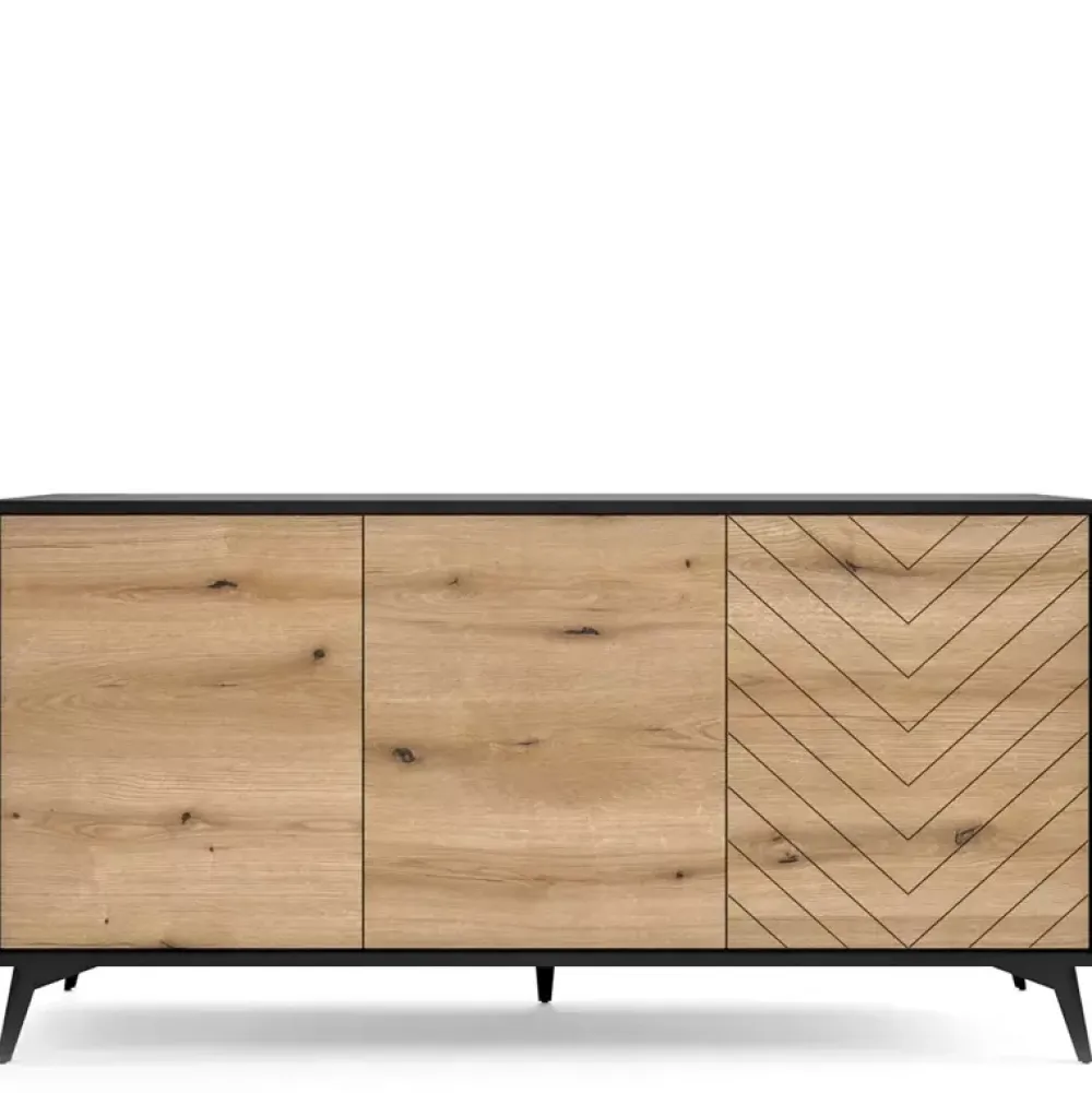 Duża komoda o szerokości 153,4 cm sprawdzi się w salonie, sypialni, ale także w biurze. Komoda została wyposażona w półki, na których ułożysz ważne dokumenty lub tekstylia. Na prawym froncie widnieje przepiękna jodełka. Komoda osadzona jest na czarnych, metalowych nóżkach o wysokości 14 cm. Komoda nie posiada uchwytów, ponieważ wyposażono ją w wygodny w użytkowaniu system push to open. Czarny korpus świetnie komponuje się z drewnopodobnym odcieniem dębu evoke.