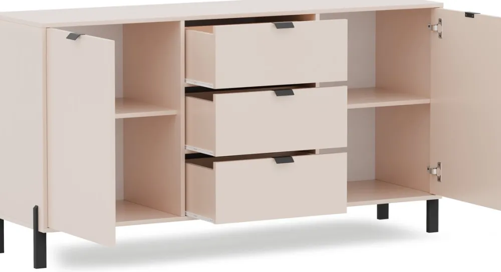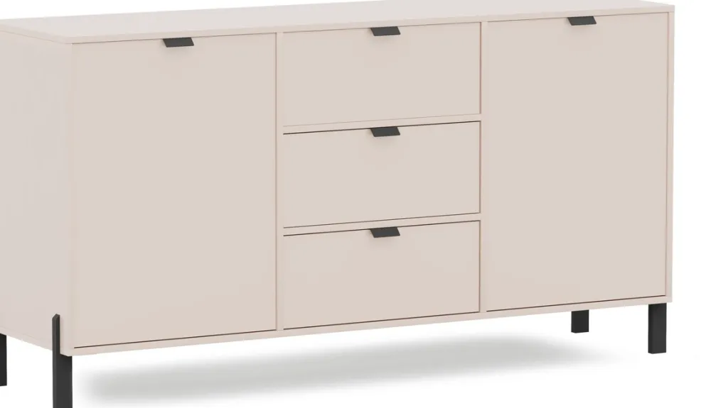 - Komoda CALISSA 160 cm z 3 szufladami i 2 szafkami z półkami. Matowe wykończenie w piaskowym beżu, czarne uchwyty i nóżki. Duża pojemność i elegancki wygląd idealny do salonu, sypialni lub biura.