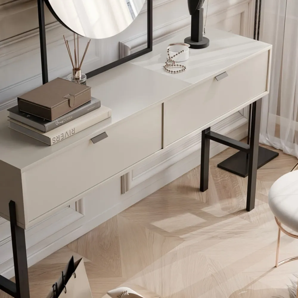 Duża komoda CALISSA to idealne rozwiązanie dla osób ceniących porządek i nowoczesny styl. Wyposażona w trzy pojemne szuflady oraz dwie zamykane szafki z półkami, oferuje mnóstwo miejsca do przechowywania. Matowe, piaskowe wykończenie i czarne detale wprowadzają do wnętrza elegancję i lekkość.