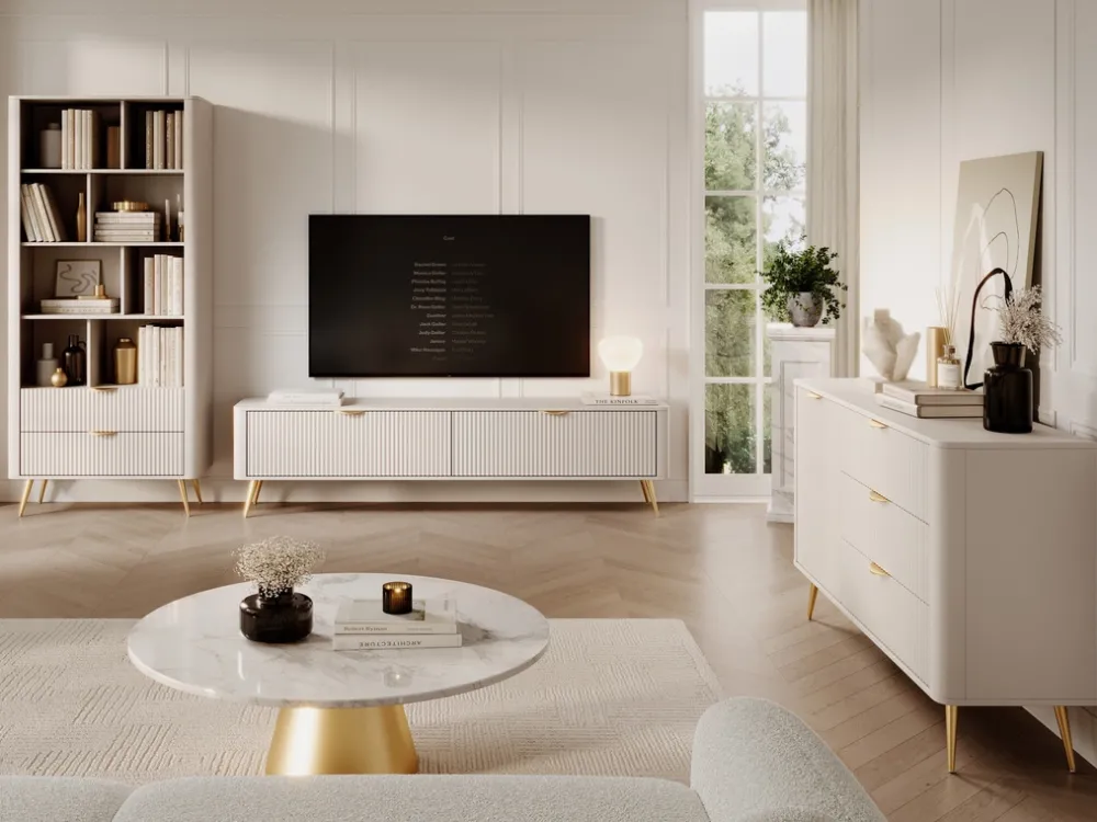 Zestaw mebli LEONTE to perfekcyjny wybór do salonu urządzonego w stylu nowoczesnym, glamour lub minimalistycznym. Regał pozwala wyeksponować najpiękniejsze przedmioty, komoda dba o organizację przestrzeni, a szafka RTV łączy elegancką estetykę z wygodą użytkowania sprzętu elektronicznego. Każdy element został starannie zaprojektowany – od zaoblonych listew MDF, przez złote detale, po precyzyjne wykonanie z wysokiej klasy materiałów.