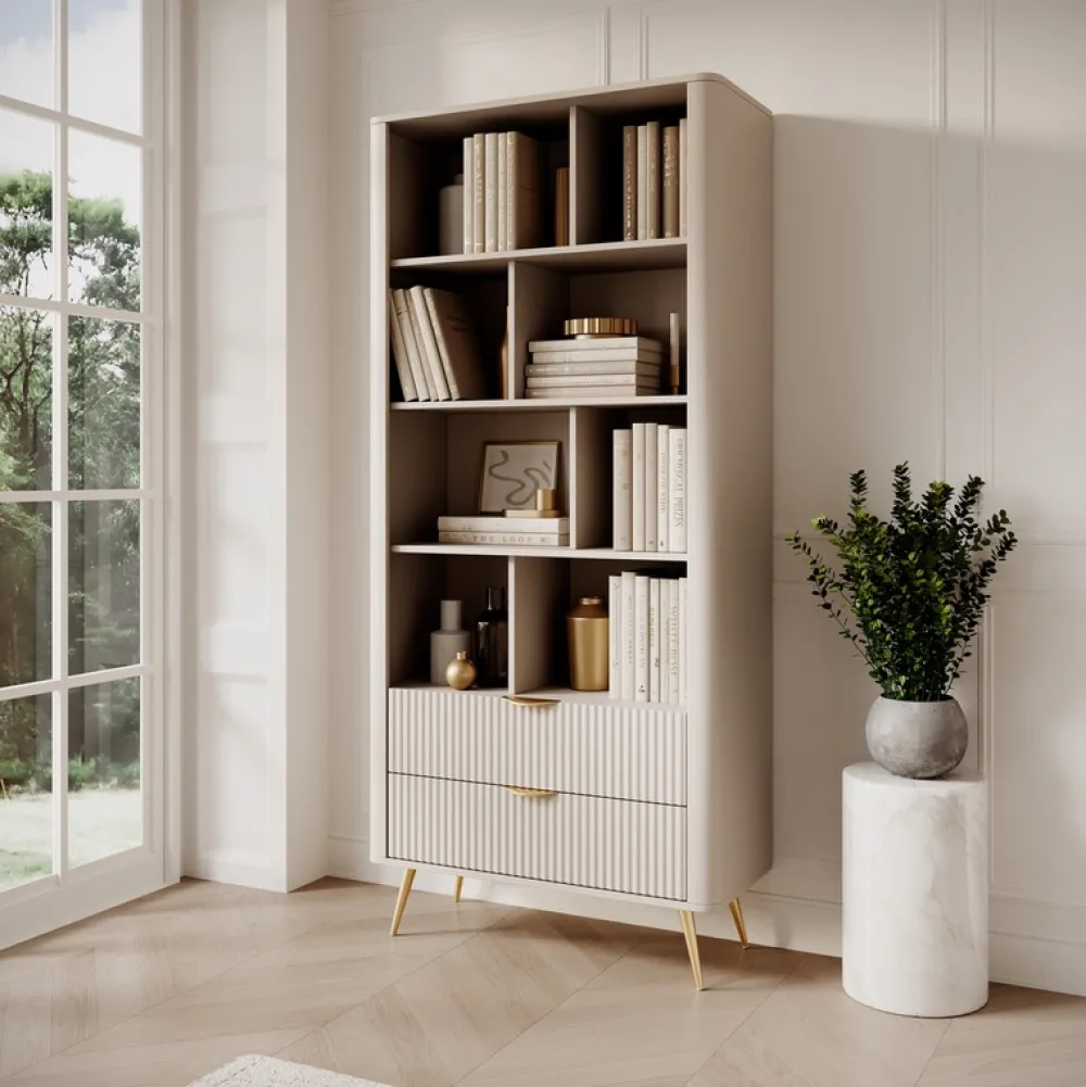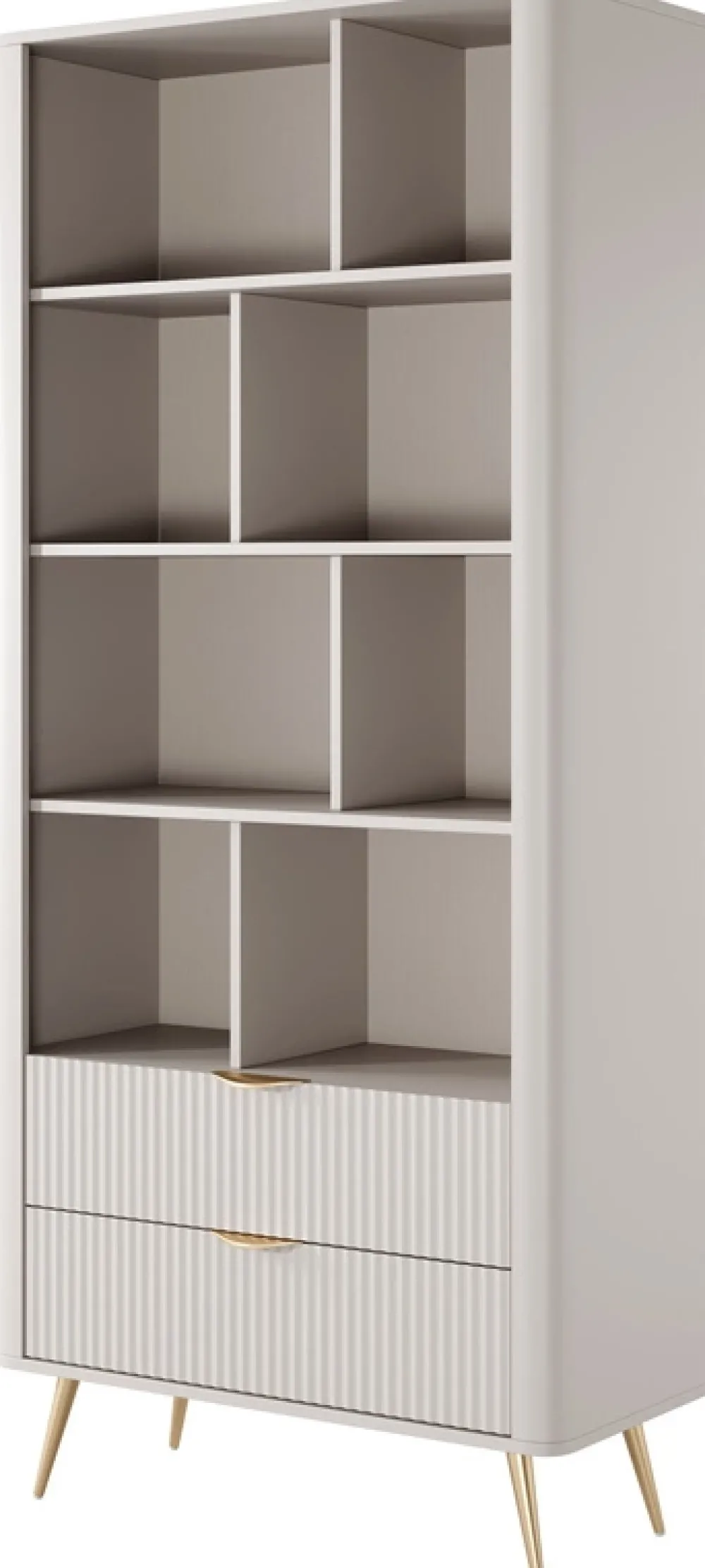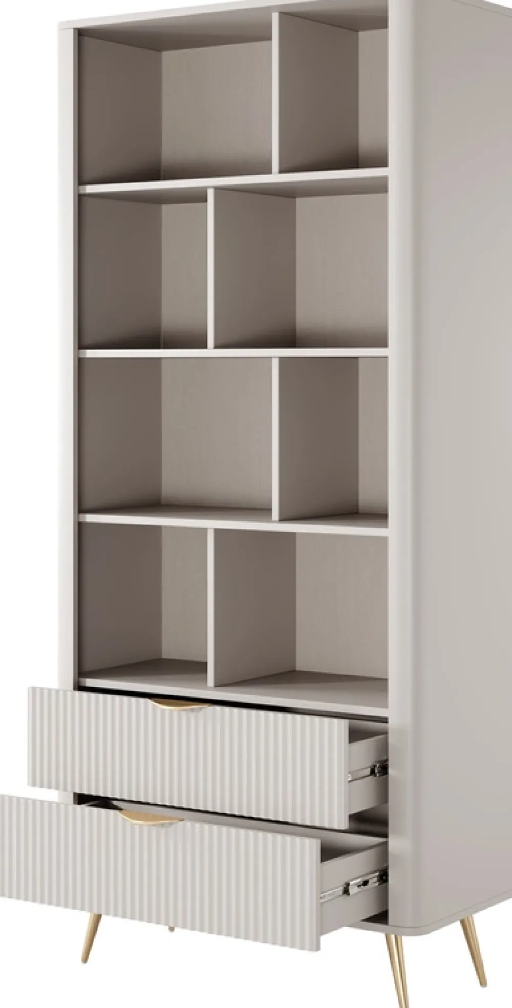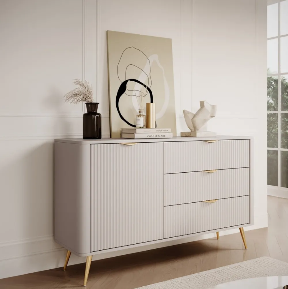 - Zestaw mebli LEONTE w kolorze kaszmir ze złotymi detalami. Regał, komoda i szafka RTV tworzą elegancką i funkcjonalną całość. MDF, pełen wysuw i nowoczesny styl – idealny wybór do salonu glamour, modern classic lub minimalistycznego.