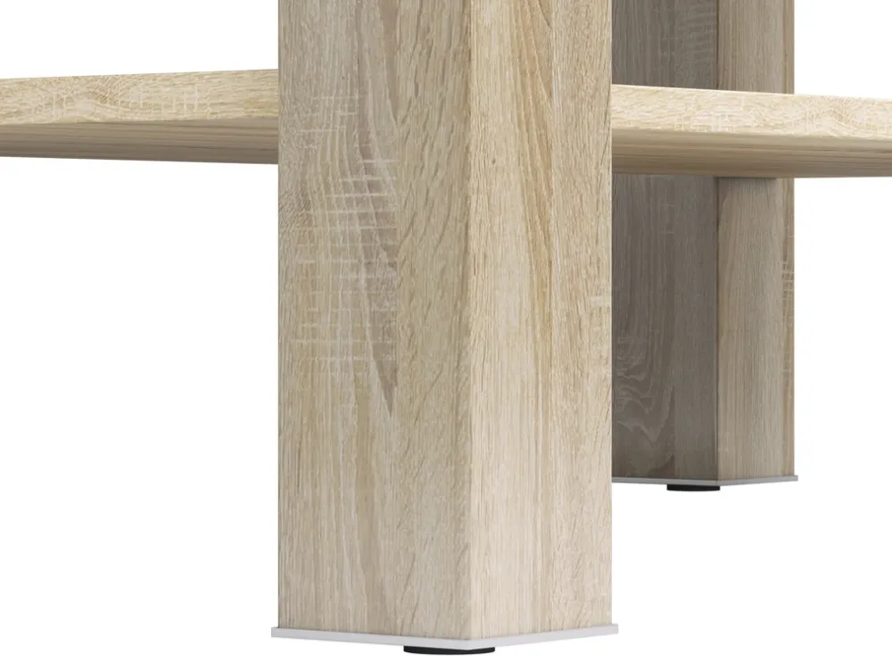 Stolik wyróżnia się nowoczesnym designem, a jego naturalny odcień dębu sonoma doskonale współgra z różnorodnymi stylami wnętrzarskimi, od skandynawskiego po klasyczny. Solidna konstrukcja gwarantuje długotrwałe użytkowanie, a obrzeża wykończone okleiną ABS zwiększają odporność na uszkodzenia mechaniczne, takie jak zarysowania czy obicia.