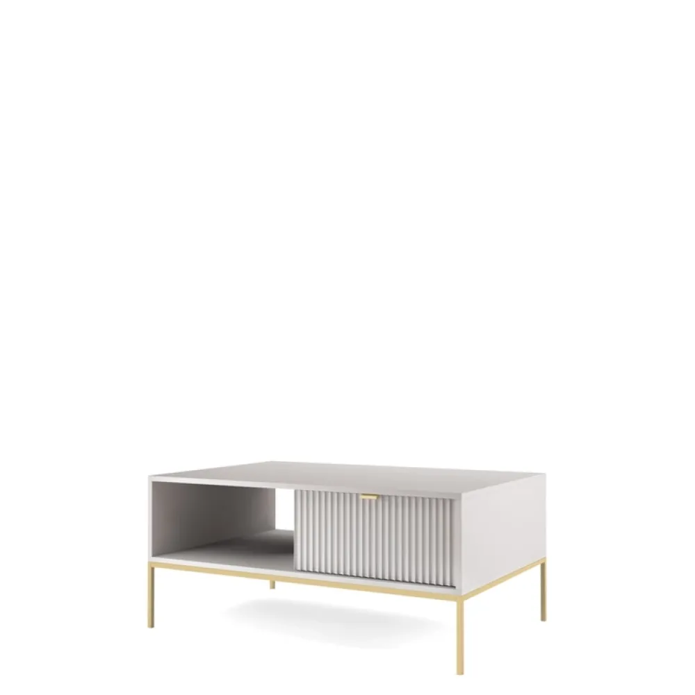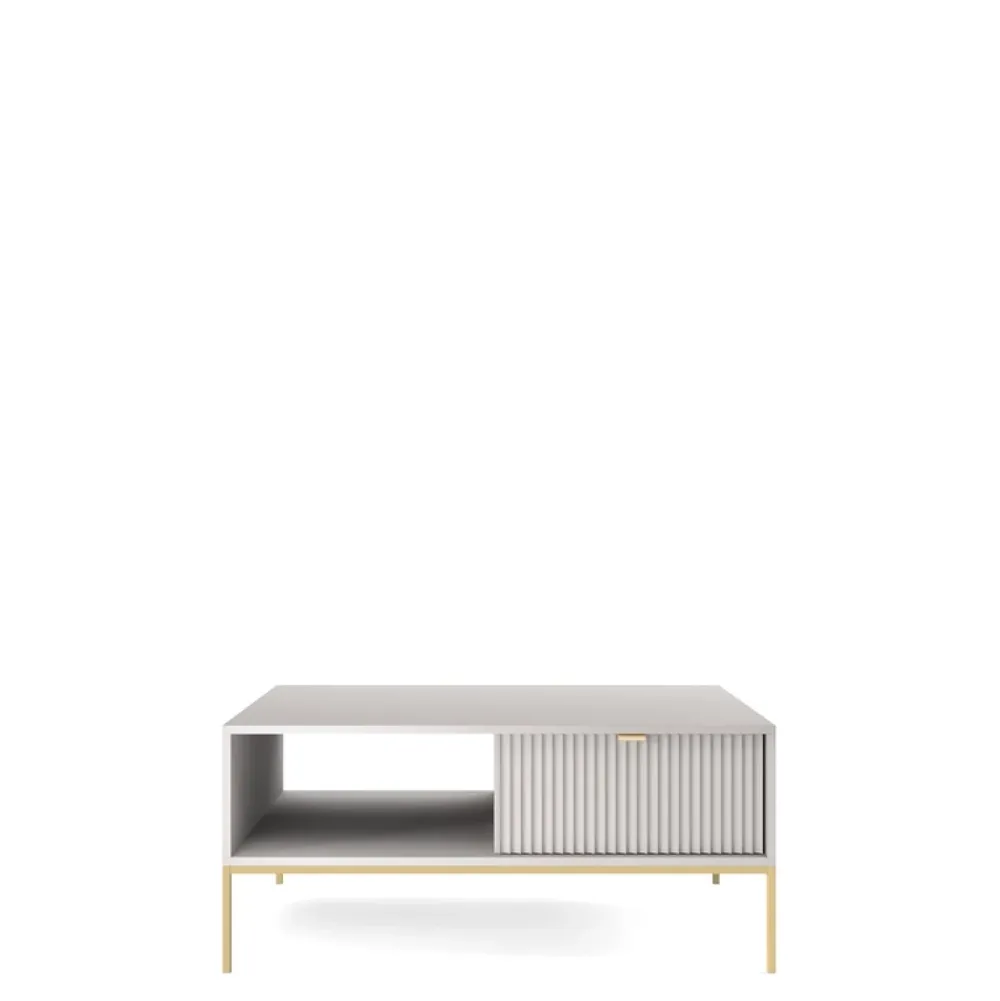 - Stolik kawowy AVANTI w szarości – elegancja w stylu glamour. Ryflowane fronty MDF i korpus tworzą wyrafinowany zestaw, który dopełniają złote metalowe nogi. Przytulny kącik z szufladą i otwartą półką. Idealne połączenie luksusu, stylu i praktyczności!