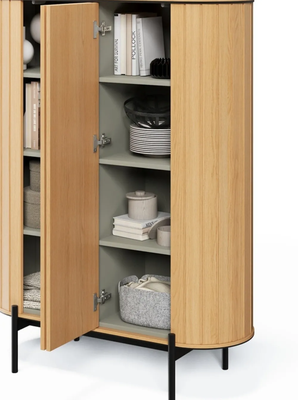 - Wnętrza mebli razem z półkami wykonane zostały w kolorze eukaliptus.