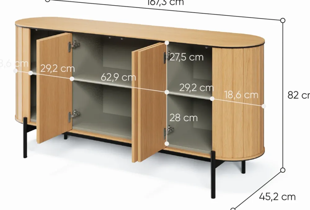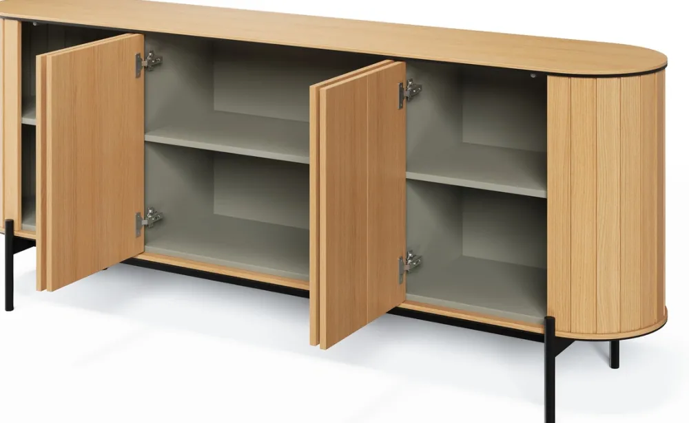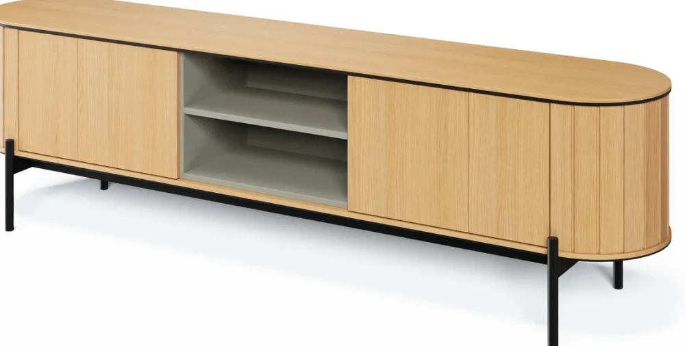 Wysoka komoda na nóżkach ROTTO, oferuje sporo miejsca do przechowywania. Będzie ona idealna do ukrycia różnych przedmiotów codziennego użytku. Szeroka komoda z czterema drzwiami to doskonałe rozwiązanie do przechowywania większych rzeczy, a jej prosta forma i naturalne wykończenie wnoszą ciepło do wnętrza. Szafka RTV z dwoma otwartymi półkami to funkcjonalny mebel, który świetnie sprawdzi się jako centrum rozrywki w salonie, umożliwiając wygodne umiejscowienie sprzętu audio-wideo.