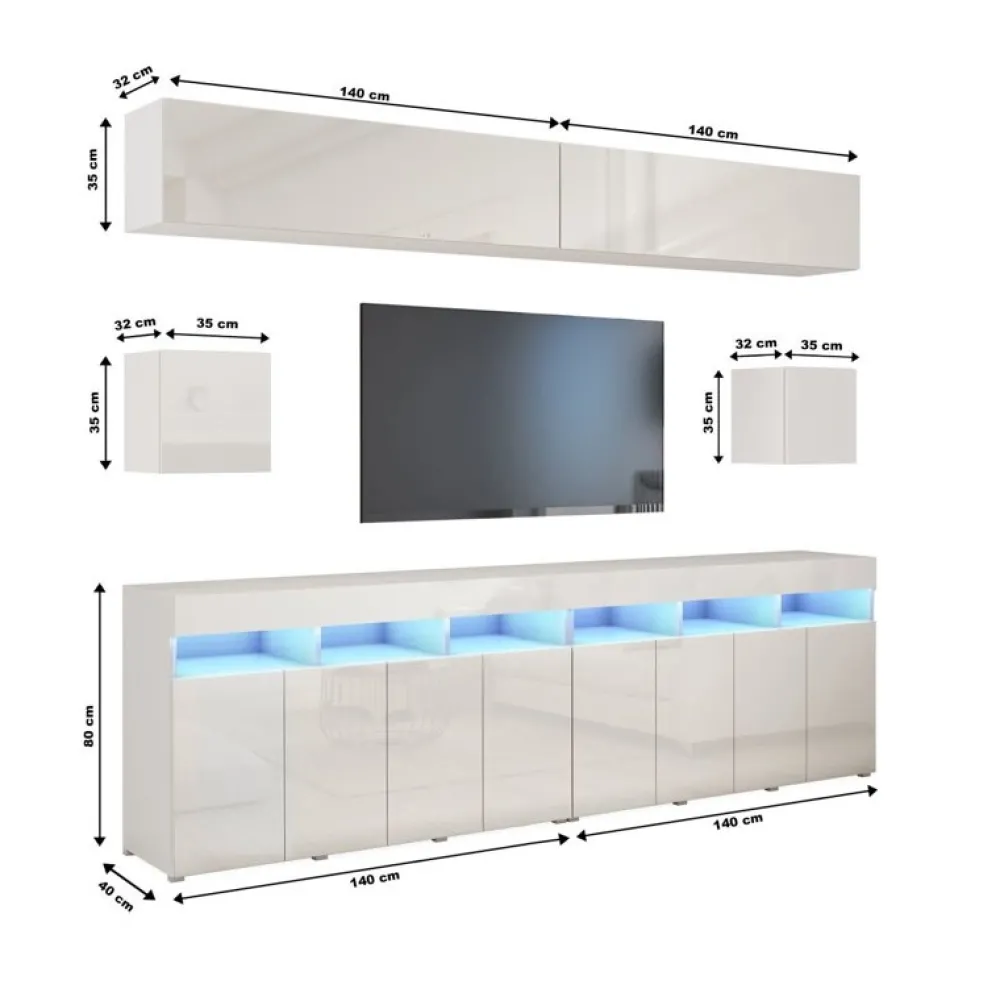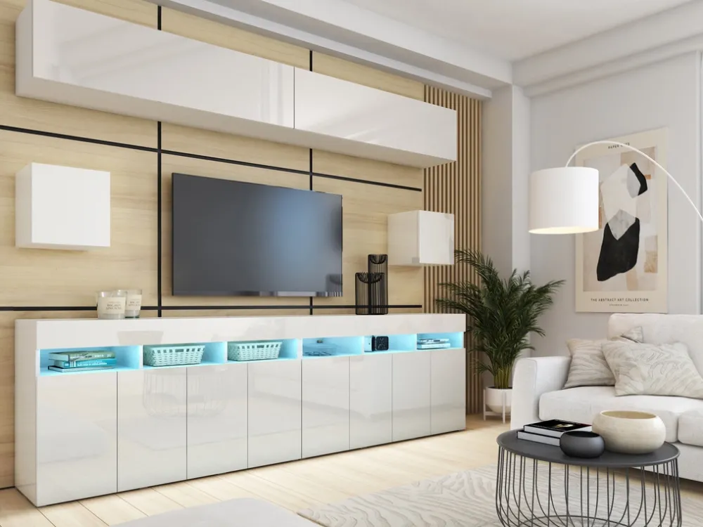 - Dwie nowoczesne komody do salonu w zestawie z barkami i szafkami wiszącym.