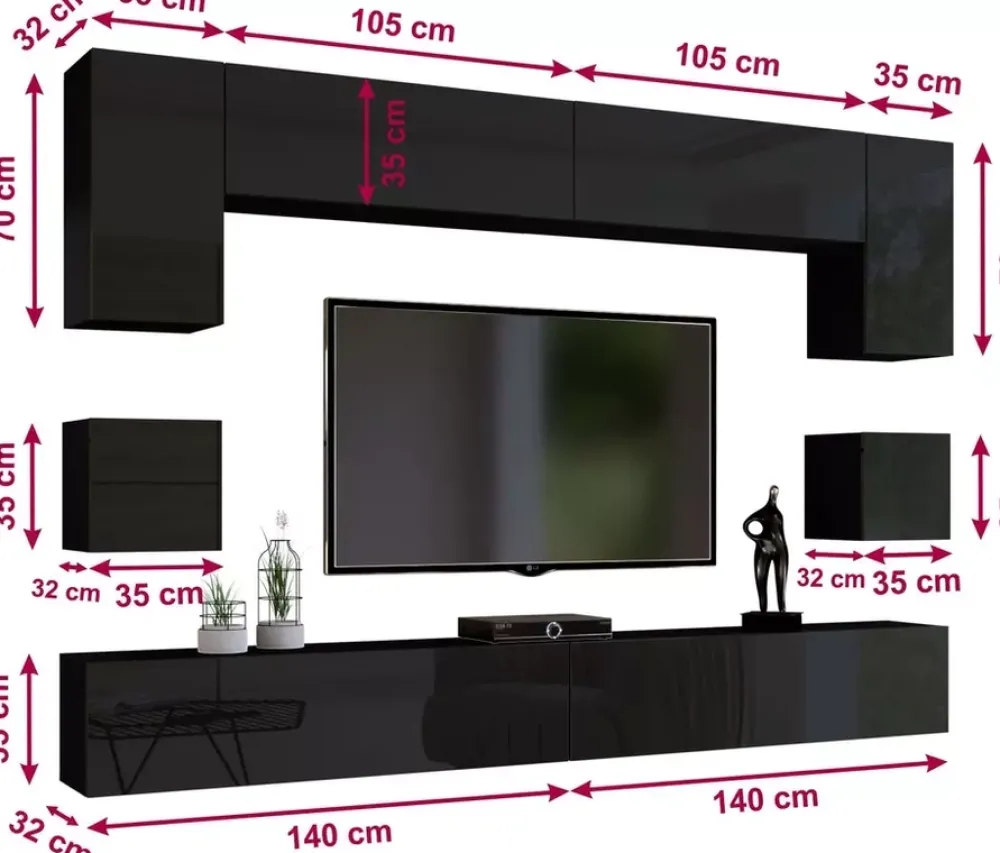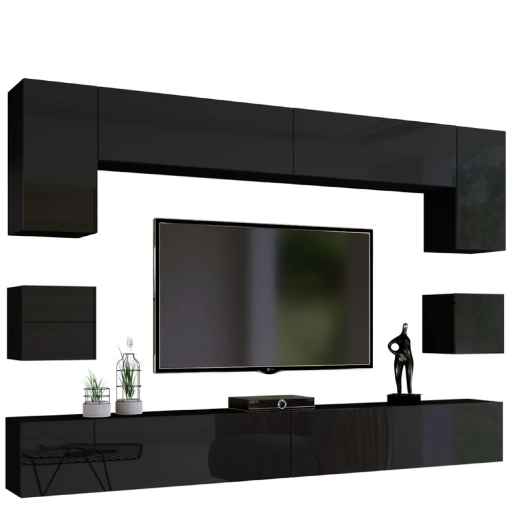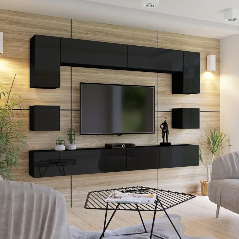 Zaprojektowana z myślą o najbardziej wymagających entuzjastach designu, nasza czarna meblościanka, z wykończeniem na wysoki połysk, jest wyborem dla tych, którzy cenią sobie klasę i wygodę, nie rezygnując z nowoczesnego i śmiałego wyglądu. Ta nowoczesna meblościanka dodaje przestrzeni elegancji i wyrafinowania, jednocześnie pozostając funkcjonalna i praktyczna – idealna dla współczesnych domów i eleganckich salonów.