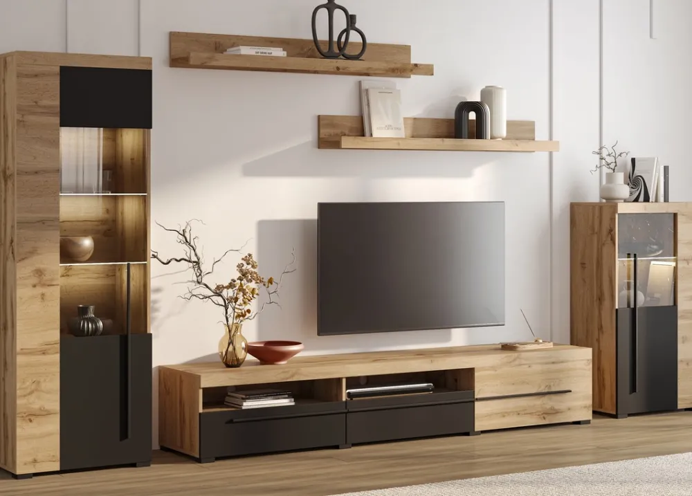 - Kompletna strefa dzienna – witryny, szafka RTV i półki zapewniają miejsce na sprzęt, książki i ozdoby