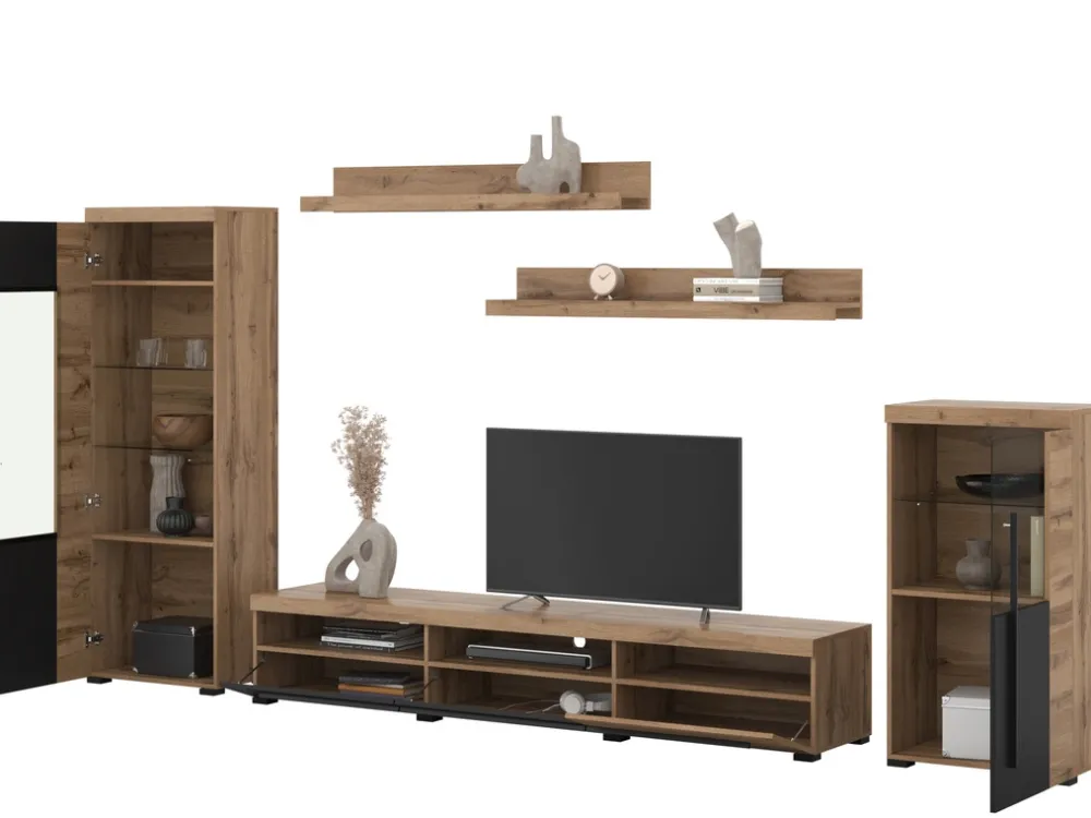 - Meblościanka ROGER w kolorze dąb wotan z czarnymi detalami. Zestaw obejmuje wysoką i niską witrynę z przeszklonymi frontami, szafkę RTV z oraz dwie półki ścienne. Czarne uchwyty i nóżki podkreślają loftowy charakter. Opcjonalne podświetlenie LED.