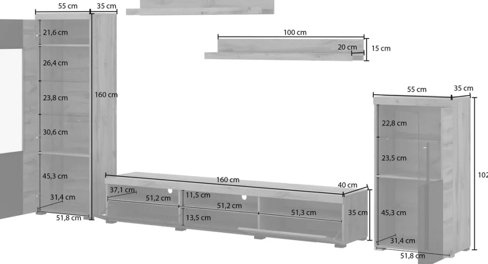 - Witryna wysoka: szerokość 55 cm, wysokość 160 cm, głębokość 35 cm