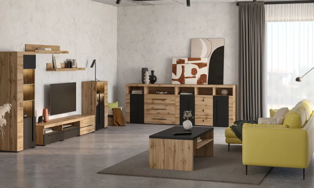 Meblościanka do salonu ROGER – dąb wotan i czarne detale w nowoczesnej odsłonie