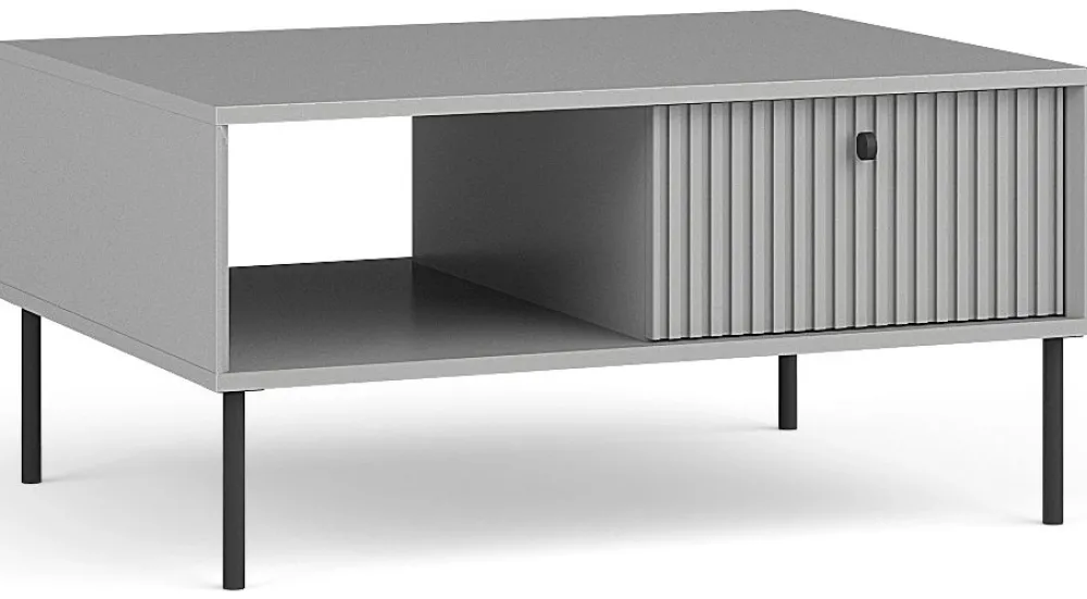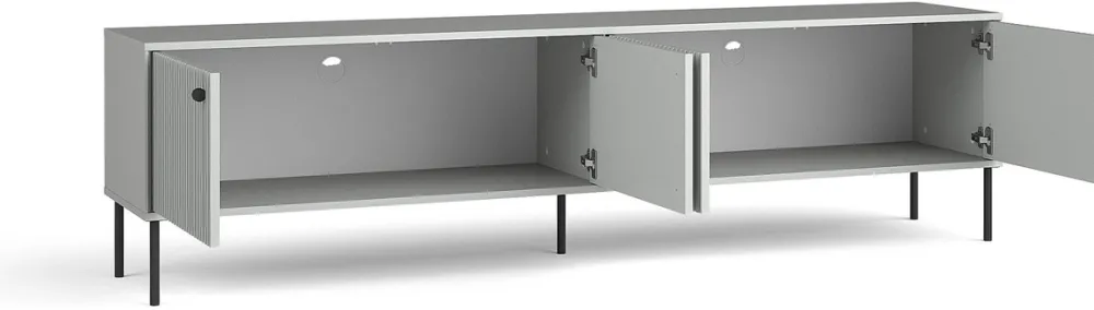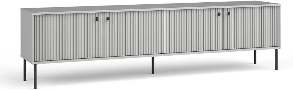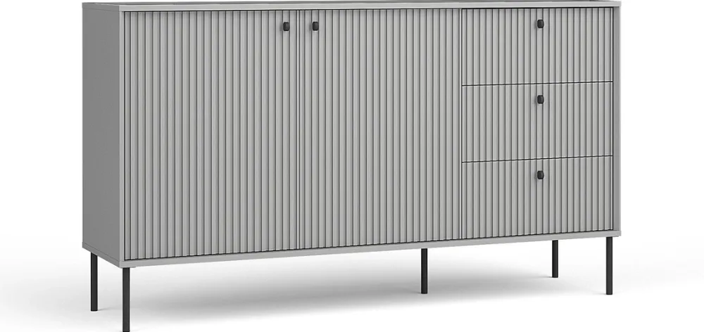 - Zestaw mebli do salonu IRYS – komoda, witryna, szafka RTV i stolik kawowy w szarym macie z ryflowanymi frontami i czarnymi, metalowymi nogami. Połączenie elegancji, funkcjonalności i nowoczesnego designu, które odmieni każde wnętrze i wprowadzi harmonię.